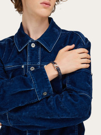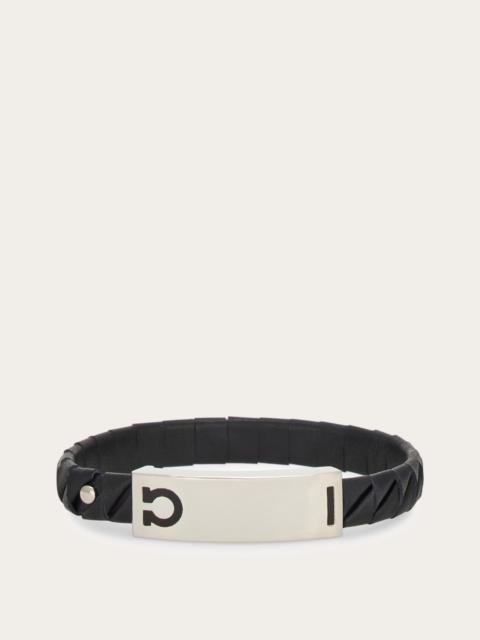 Embrace timeless elegance with this leather bracelet, adorned with a contemporary twist on the new Gancini ornament. This elegant bracelet features a distinctive braided strap, where the leather is meticulously woven into a sleek and tight pattern, adding texture and dimension. - Composition: calfskin and brass - Made in ITALY - Product code: 770378 780299