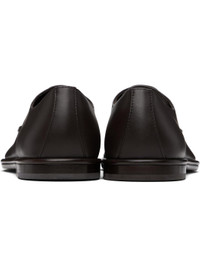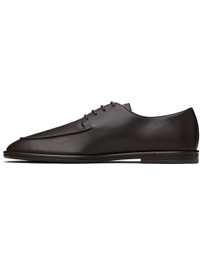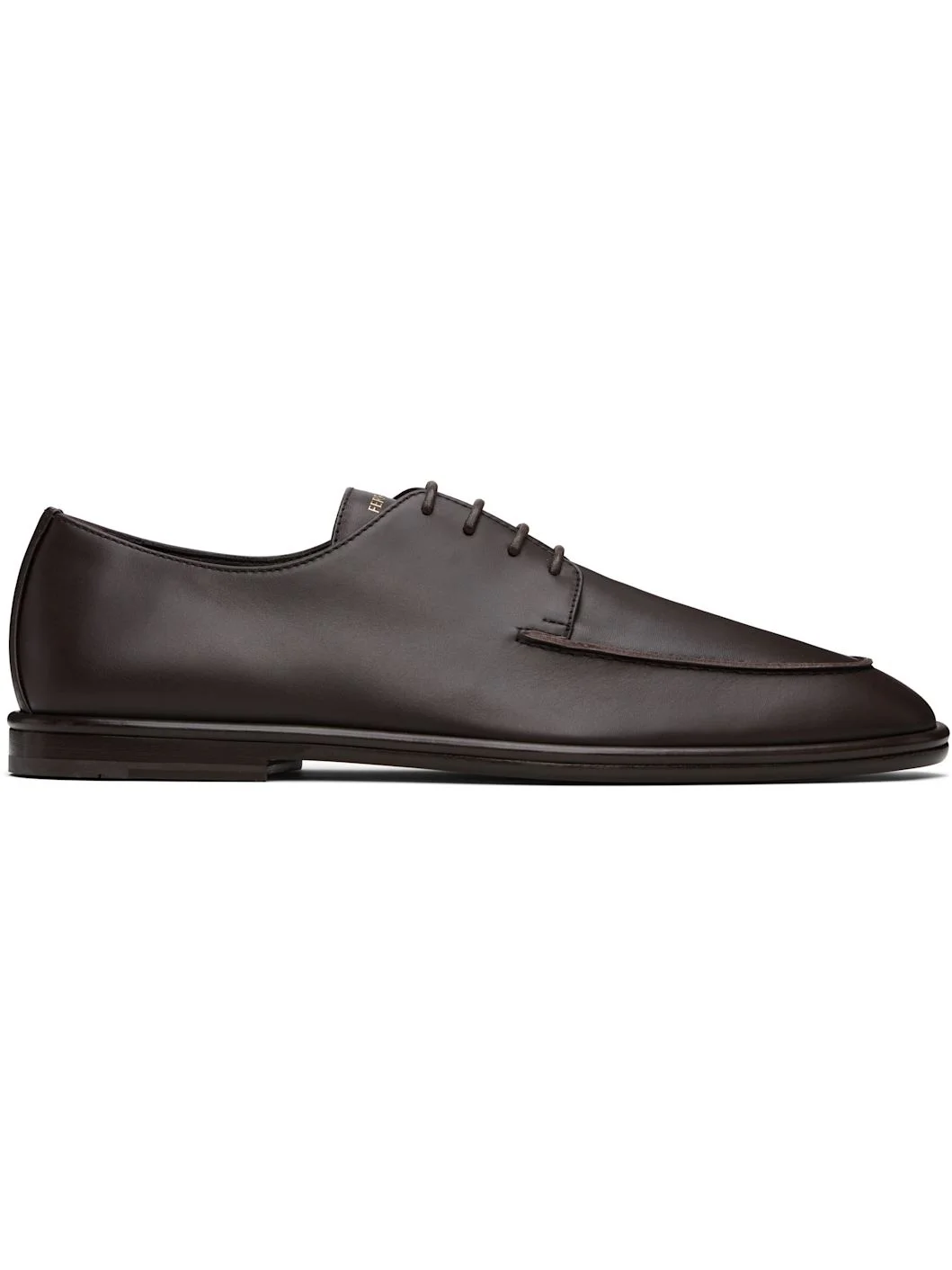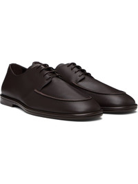 Buffed nappa calfskin derbys in brown. · Moc toe · Lace-up closure · Gold-tone logo stamp at tongue · Grained calfskin lining · Stacked calfskin heel with rubber injection · Calfskin sole Supplier color: Testa di moro Calfskin. Made in Italy 251270M225013