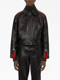 contrasting-panels zip-up leather jacket Highlights - Black/bright red - Nappa leather - Grained texture - Contrasting panel detail - Decorative zip detailing - Adjustable waist straps - Pointed flat collar - Concealed front fastening - Long sleeves - Two side welt pockets - Straight hem Made in Italy Composition Outer: Nappa Leather 100% Lining: Rayon 100%