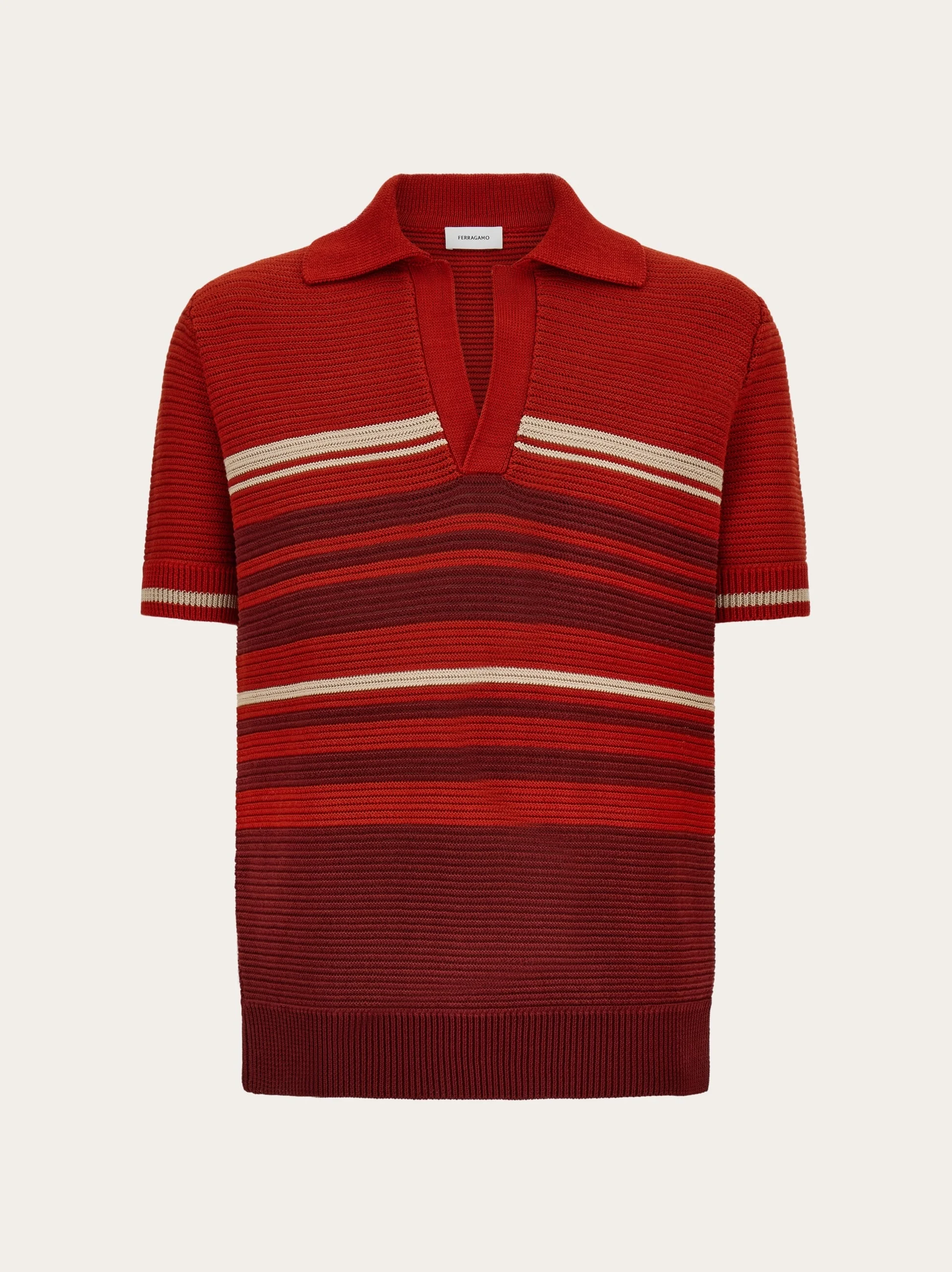 A color block stripe adds a bold twist to this cotton knit polo shirt. Crafted by machine to mimic the handmade crochet effect, the rippled texture opens to a V-neck with 70's inspired collar. - Composition: 100% cotton - Made in ITALY - Product code: 144762 783885