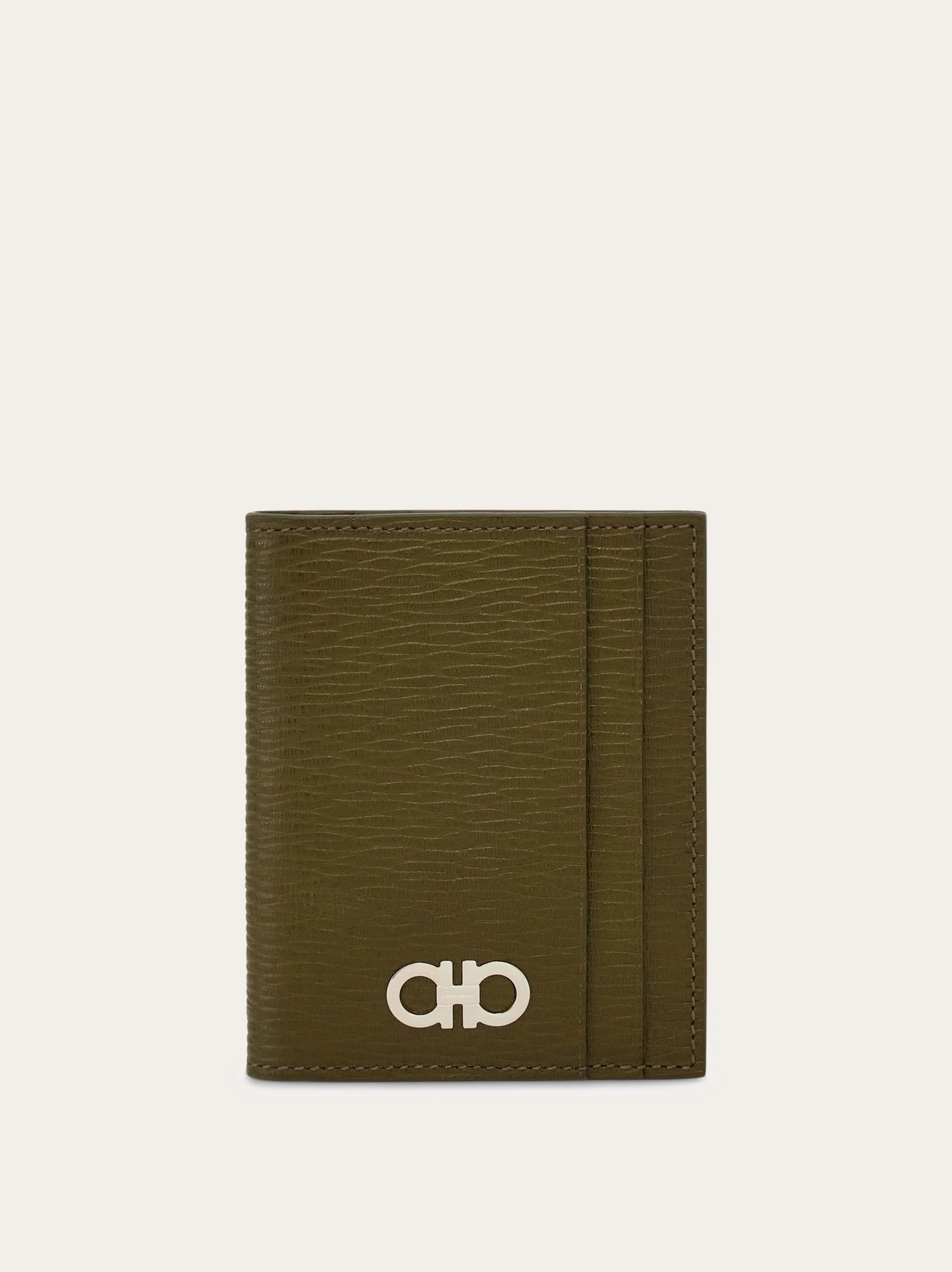Elegant and practical with a compact design, this new credit card holder in hammered calf leather has a contrasting interior for a modern color pop. Slots on both the inside and outside ensure the best use of space for the gentleman on the go. The iconic Gancini in a palladium finish graces the front. - height 3.7 IN length 6.2 IN - Composition: hammered calfskin - Made in ITALY - Product code: 660371 779753
