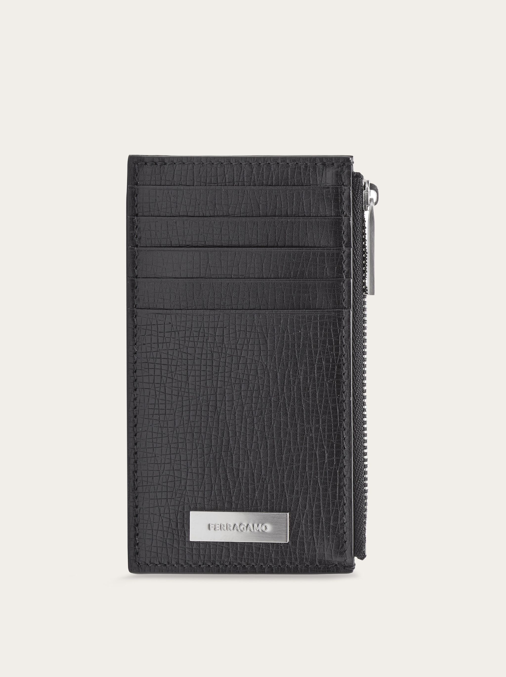 New credit card holder with practical features and stylish finishes. It has slots on both sides, and a horizontal zip pocket for coins and receipts. It has a custom metallic plate on the front. - height 7.0 CM / 2.7 IN length 13.0 CM / 5.1 IN - Composition: hammered calfskin - Product code: 661226 763284 - Made in ITALY