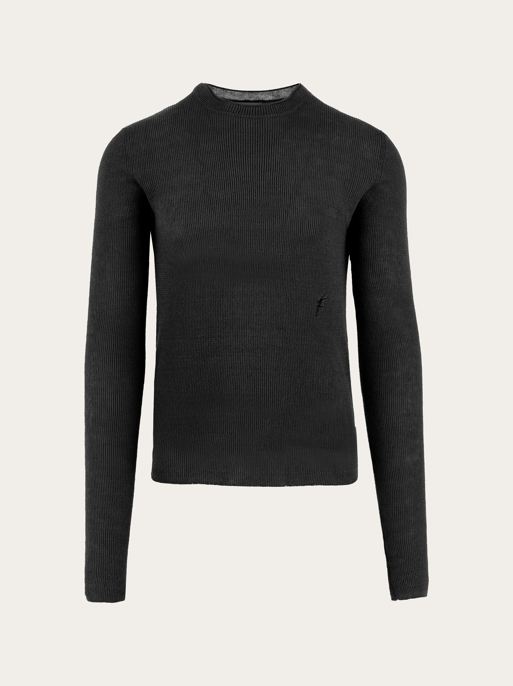 A summer essential in a deluxe key: crew neck sweater made of pure interlock linen. The compact fisherman’s rib knit highlights the quality and texture of the yarn and subtle details such as the fine ribbing and rolled edge on the collar, dropped stitches on the armholes and the straight cut hem. An embroidered F features on the bust. - Composition: 100% linen - Made in ITALY - Product code: 122359 772667