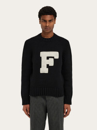 Varsity style sweater with a sporty twist on the Ferragamo motif. Made of the softest blend of wool and cashmere with a bold, chenille F on the front, this crew neck sweater has ribbed trims around the collar, cuffs and bottom hem. Regular fit. - Composition: 70% wool, 30% cashmere - Made in ITALY - Product code: 122638 781056