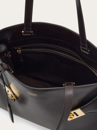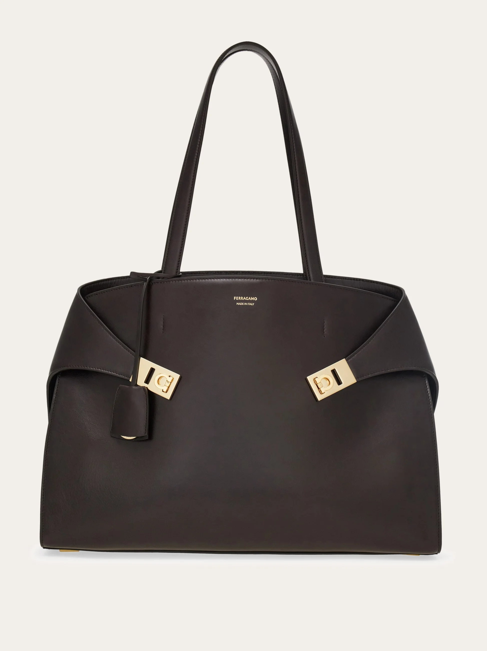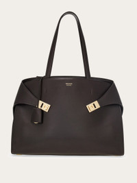 Generous proportions and sleek lines define this new version of the Hug shoulder bag, crafted from grained calfskin. The signature wraparound sides fasten at the front with satin palladium-finish buckles and are accented by a keychain charm with a covered ring. The interior is fully lined and spacious enough to hold personal items and electronic devices. The top handles can be tucked inside, allowing the bag to be worn as an oversized clutch. A detachable long strap offers an additional styling option. - height 12.2 IN length 17.7 IN width 6.1 IN - Composition: hammered calfskin - Made in ITALY - Product code: 241813 787661