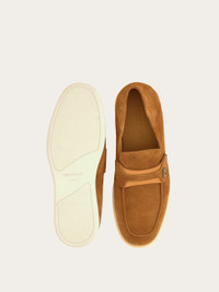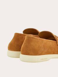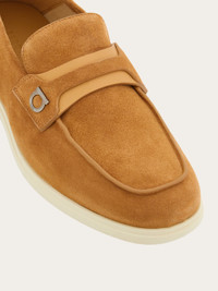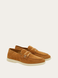 Casual and cool, with a luxurious feel, this soft Ferragamo loafer is made from the softest Italian suede. The almond toe is complemented by a raw edged piping around the vamp to echo an off duty vibe. The double crossbar over the instep is punctuated by a small Gancini buckle with a titanium finish. Flexible white rubber sole. - Composition: calf suede - Made in ITALY - Product code: 021599 768474