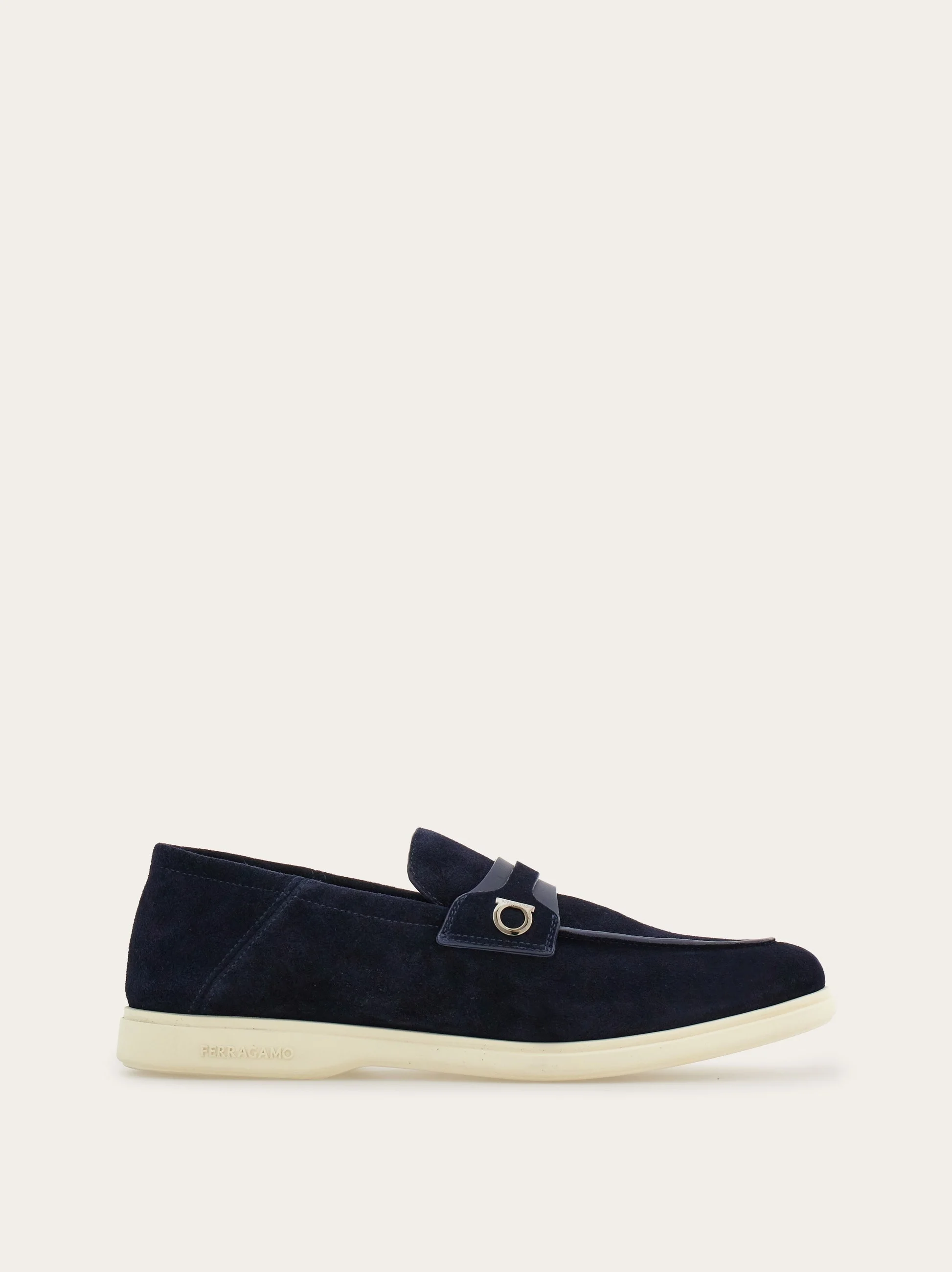 Casual and cool, with a luxurious feel, this soft Ferragamo loafer is made from Italian calfskin. The almond toe is complemented by a raw edged piping around the vamp to echo an off duty vibe. The double crossbar over the instep is punctuated by a small Gancini buckle with a titanium finish. Flexible white rubber sole. - Composition: calf suede - Made in ITALY - Product code: 021599 769253