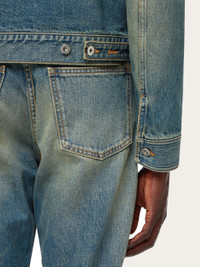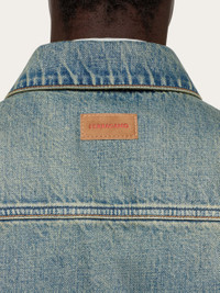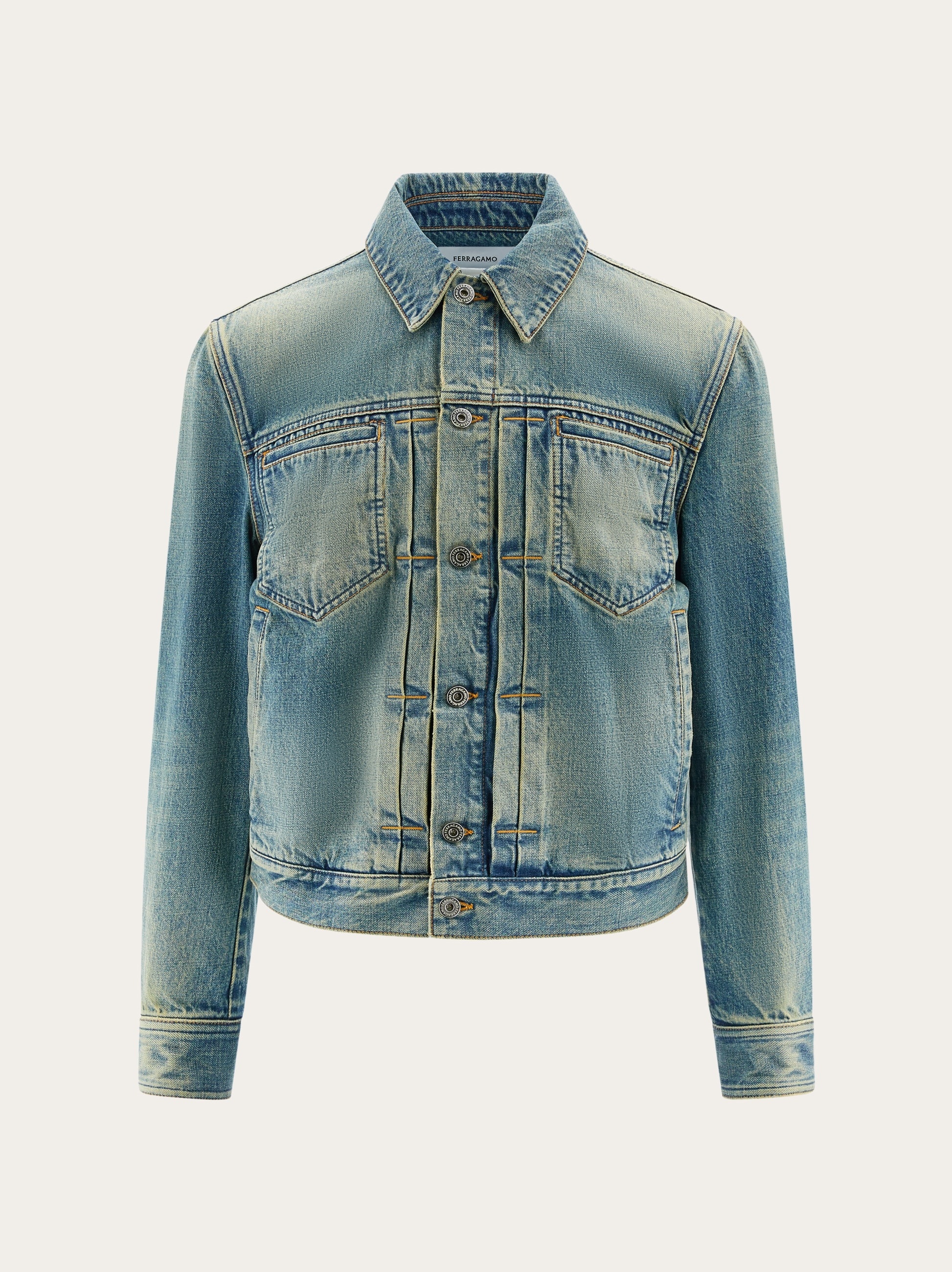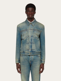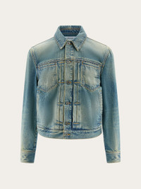 The denim trucker, revised by Ferragamo in a high end key. This mid-season jacket is perfect for off duty looks with an edge. All the textbook elements are present: donut buttons on the placket and cuffs, frog fastening to cinch the waist, shirt collar, and front and back yoke, with a high fashion attention to detail. The stone wash is faded to outline the seams, welt pockets are cut on the chest, and a small custom tab is placed at the back. - Composition: 100% cotton - Made in ITALY - Product code: 143959 775686