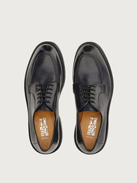 A traditional handcrafting process, Tramezza represents the ultimate in men's handcrafted footwear, for which Ferragamo is world famous. The procedure entails a thick yet flexible layer of leather being skillfully sandwiched between the insole and the sole, like a cushion. This Derby shoe, with its casual chic flair, is made of Italian calf leather with wide stitching on the vamp. The look is contemporary, with a masculine allure and a touch of metropolitan grit enhanced by the painted eyelets, rolled welt and leather sole with customized rubber tread. - Composition: Calf leather - Made In ITALY