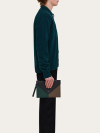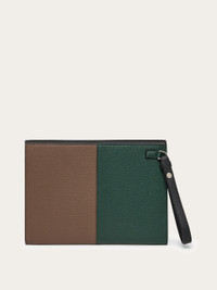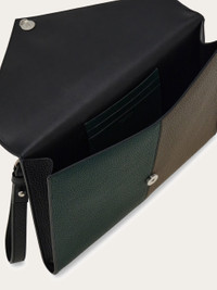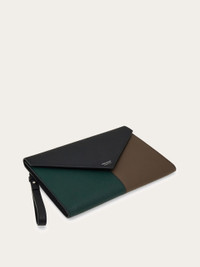 An innovative take on the document holder, featuring contrast-tone panels for a bold color-block effect. The sleek envelope design includes a flat back pocket and interior slots for cards and documents. Finished with a snap-button closure and a removable wrist strap on the back for added versatility. - height 7.4 IN length 9.8 IN width 0.7 IN - Composition: hammered calfskin - Made in ITALY - Product code: 661637 785580