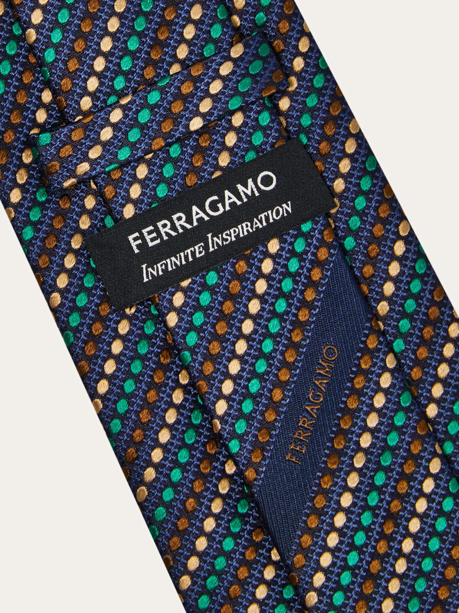 Pure silk tie with a sophisticated jacquard weave. The pattern recreates the diagonal structure of a regimental motif through a playful arrangement of colorful polka dots, offering a fresh and contemporary interpretation. Inspired by a 1960s Ferragamo archival print, the design recalls the visual rhythm of white leather straps interlaced with multicolored inserts for a refined and vibrant look. Originally conceived to embellish women’s shoes, these inspirations are now reimagined as textile motifs, transformed into jacquard with the same expressive intensity. - Composition: 100% silk - Made in ITALY - Product code: 351400 792634