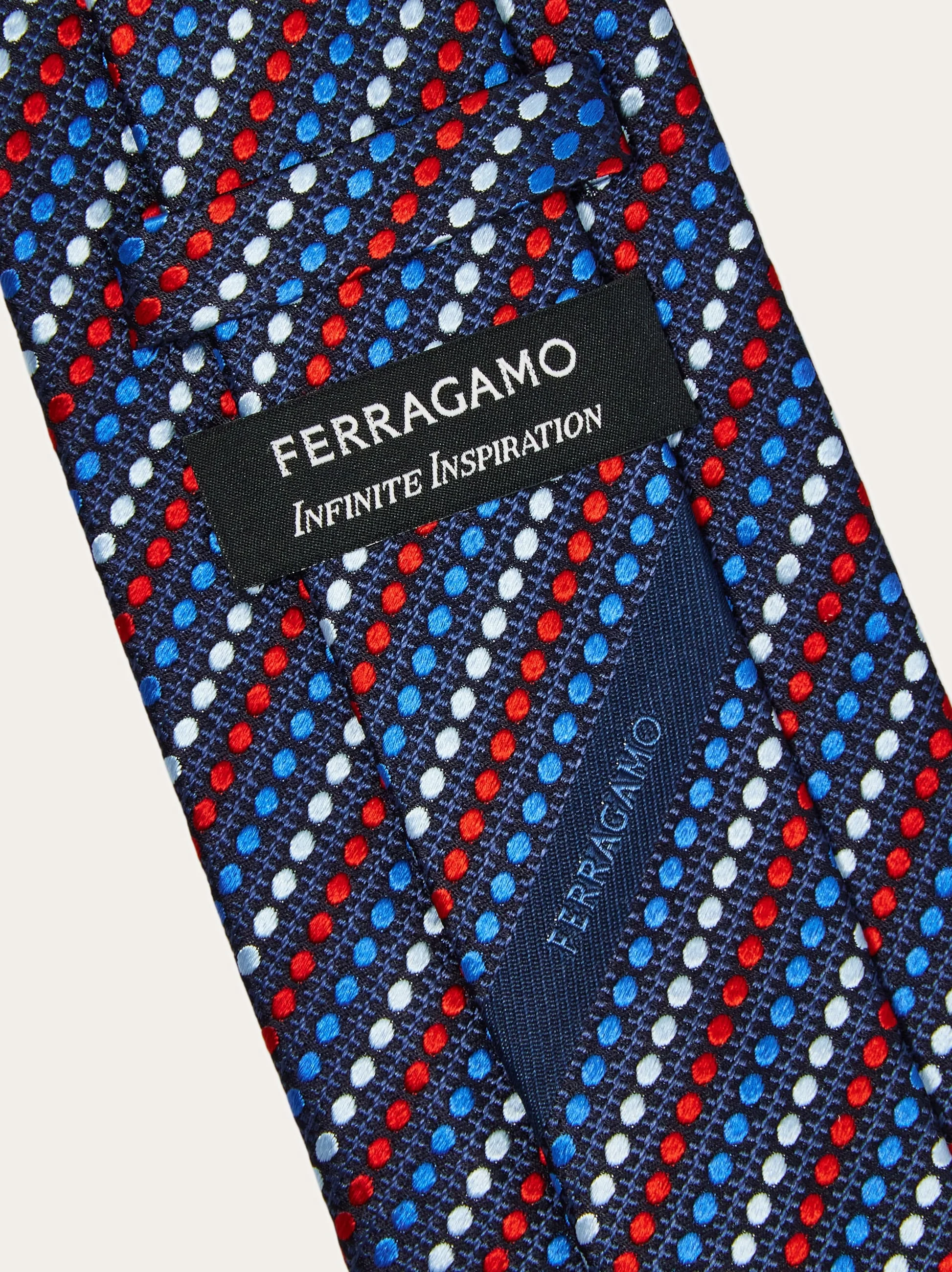 Pure silk tie with a sophisticated jacquard weave. The pattern recreates the diagonal structure of a regimental motif through a playful arrangement of colorful polka dots, offering a fresh and contemporary interpretation. Inspired by a 1960s Ferragamo archival print, the design recalls the visual rhythm of white leather straps interlaced with multicolored inserts for a refined and vibrant look. Originally conceived to embellish women’s shoes, these inspirations are now reimagined as textile motifs, transformed into jacquard with the same expressive intensity. - Composition: 100% silk - Made in ITALY - Product code: 351400 792616