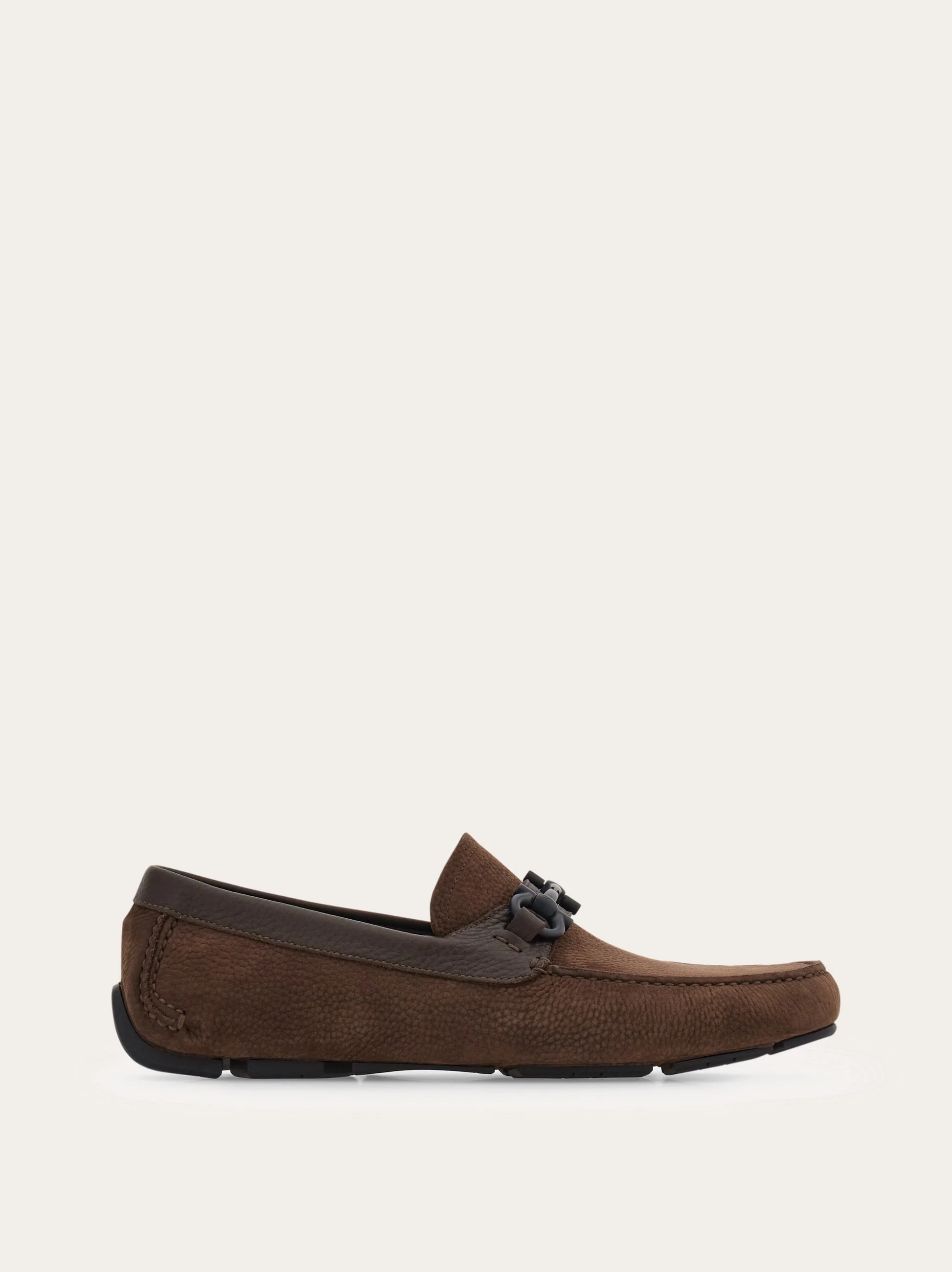 Casual yet refined, this driver loafer is crafted from naturally textured calf leather and velvety nubuck, adding depth and dimension to the sleek, rounded shape. It's finished with apron-toe seams, a lacquered Gancini buckle across the instep, and a rubber sole with custom tread. The tubular construction method, which involves meticulous hand-stitching and assembly, ensures a flexible and lightweight silhouette. - Composition: nubuck - Made in ITALY - Product code: 02C398 784300
