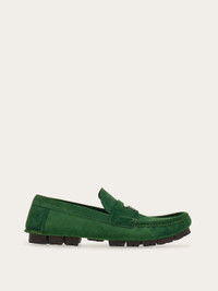 The Gancio that sits in the penny slot of this new Ferragamo loafer is inspired by a paperclip. New shapes and dimensions give a bold look to the soft suede upper with raised stitching and textbook saddle across the instep. The light flexible rubber sole has a chunky tread for a gritty look. This shoe is made with the "Tubular" technique, an exclusive method applied by high end shoemakers, whereby the sole is hand-sewn to ensure a supple, flexible finish. - Composition: suede - Product code: 023610 773004 - Made in ITALY