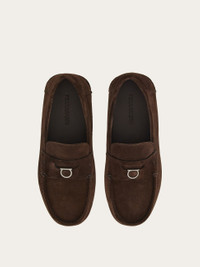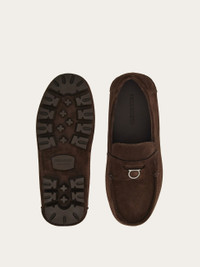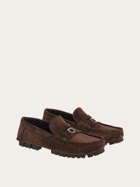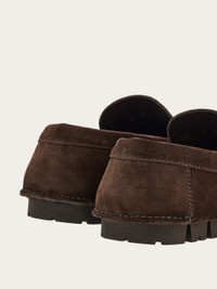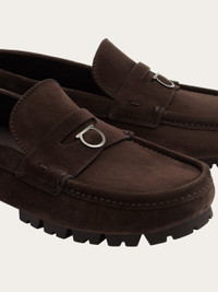 The Gancio that sits in the penny slot of this new Ferragamo loafer is inspired by a paperclip. New shapes and dimensions give a bold look to the soft suede upper with raised stitching and textbook saddle across the instep. The light flexible rubber sole has a chunky tread for a gritty look. This shoe is made with the "Tubular" technique, an exclusive method applied by high end shoemakers, whereby the sole is hand-sewn to ensure a supple, flexible finish. - Composition: suede - Made in ITALY - Product code: 023610 772477