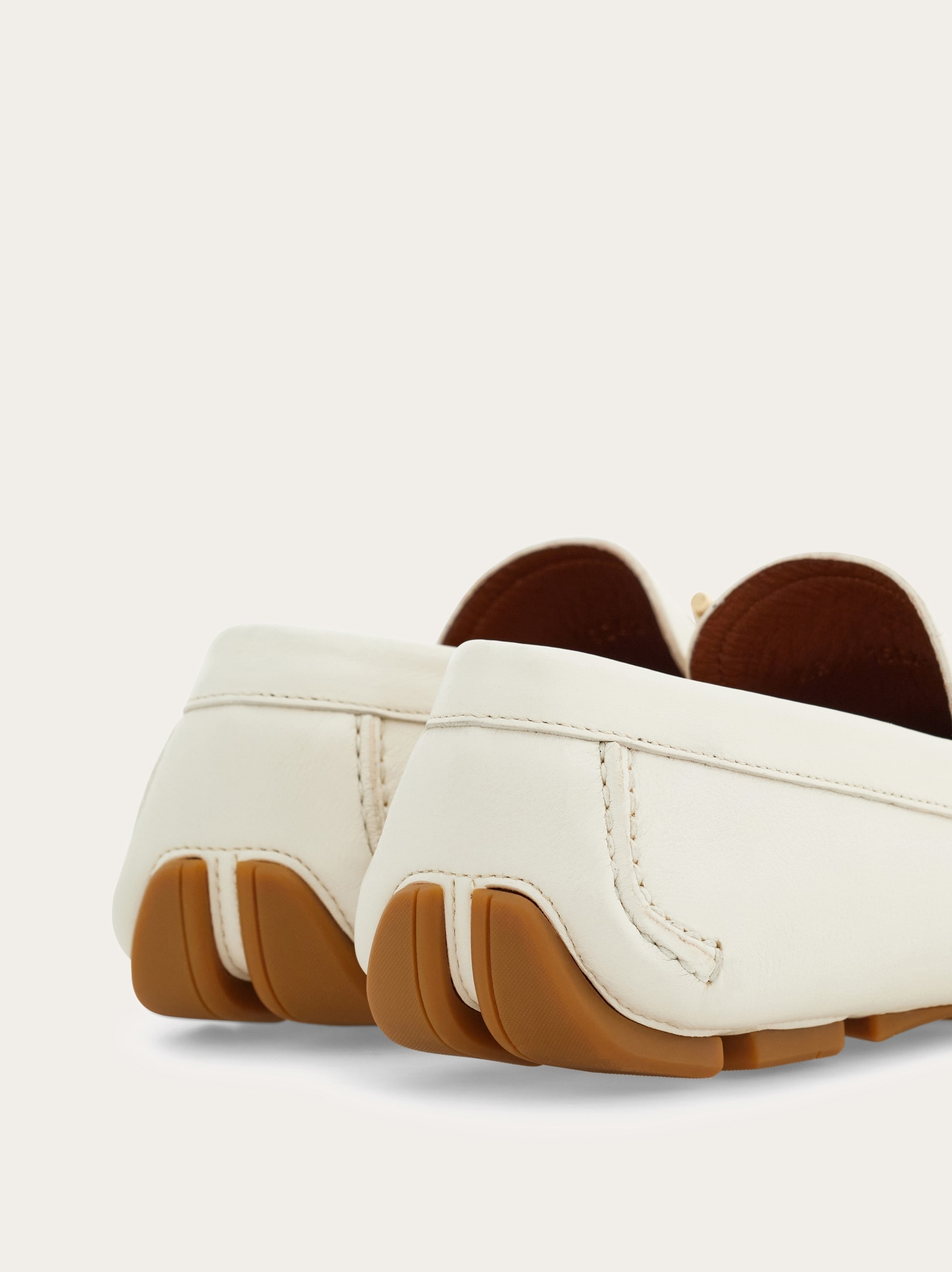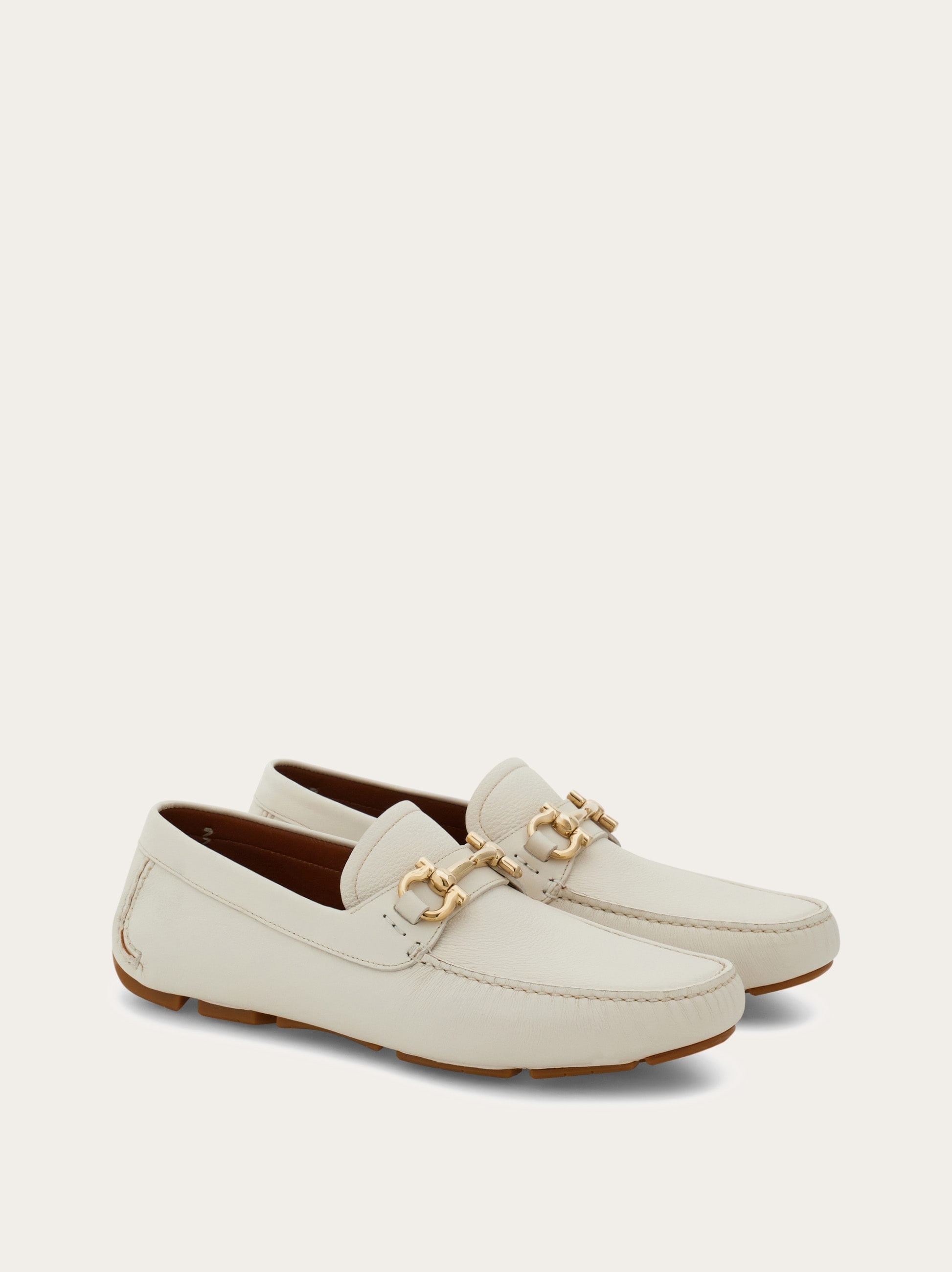 Elegant driver loafer made of hammered calfskin, vegetable dyed to accentuate the soft, supple feel of the leather. The contrasting insert at the collar adds a current twist, complemented by a Gancini buckle in a warm, golden hue. The custom rubber sole confirms a laid back look. This shoe is made with the "Tubular" technique, an exclusive method applied by high end shoemakers, whereby the sole is hand-sewn to ensure a supple, flexible finish. - Composition: hammered calfskin - Made in ITALY - Product code: 02C398 778794