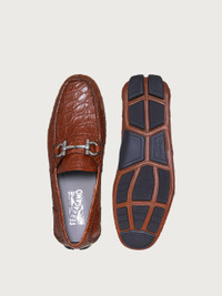 A deluxe edition of the timeless driver moccasin. Made of crocodile skin, the appeal is luxurious with a construction designed to allow flexibility and comfort. The gunmetal finish Gancini bit creates an enticing sophhisticated look. An exclusive technique, ‘Tubular’ is used to hand stitch the upper. The method guarantees exceptional softness and lightness. - Composition: alligator - Made in ITALY - Product code: 02C529 756396