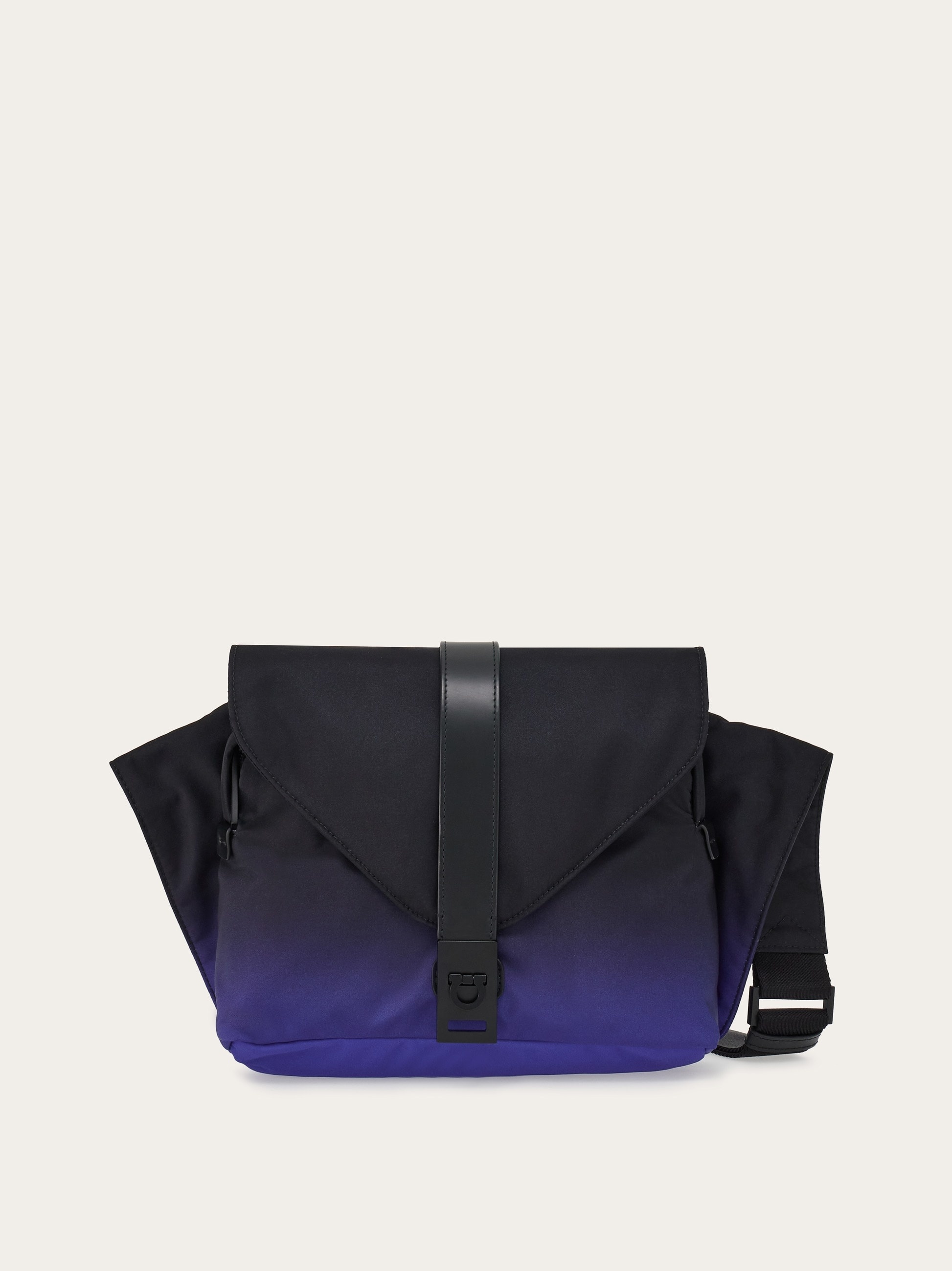 Trekking-inspired shoulder bag, made of technical fabric in a dual tone. The top flap has a calf leather strap with a tonal Gancio buckle. The flap opens to a fully organized interior, with a flat pocket and a zip pocket, and an extra zip pocket on the back. Adjustable fabric shoulder strap. - height 8.2 IN length 10.2 IN width 3.5 IN - Composition: fabric and calfskin - Made in ITALY - Product code: 241283 764781
