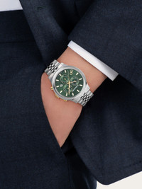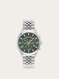 The Ferragamo Duo collection with its essential, timeless shape moves forward turning into a patented chronograph movement. Size: 42 mm Movement: VERTIME BV SM927 - Chrono Quartz Case: Stainless steel - Crown with “F” embossed Dial: Green guilloché dial, double Gancini Index at 8h Bracelet: Stainless steel bracelet - Butterfly buckle with Ferragamo logo Glass: Sapphire crystal, anti-reflection, scratch-resistant WaterResistance: 50 meters 2+2 Year Warranty Outer box, packaging, warranty and instruction booklet - Composition: Stainless steel case and bracelet - Product code: 611209 772473 - Made in SWISS