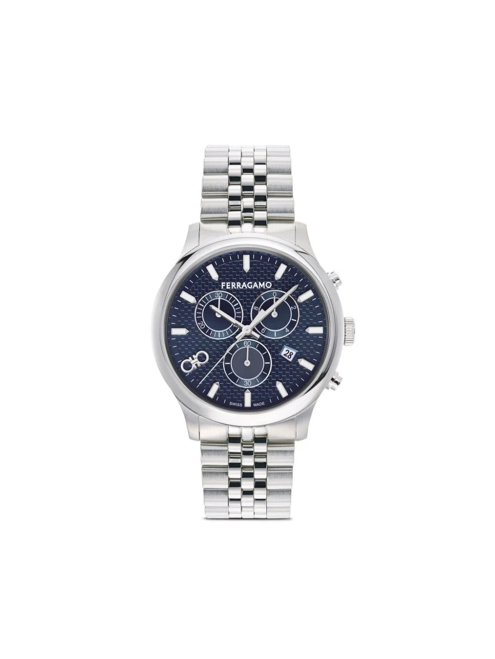 Duo Chronograph Q 42mm Highlights - 42mm - Stainless steel - Automatic movement - Navy blue - Index dial - Index hands - Three chronograph sub-dials - Round face - Screw-down crown - Stainless steel link bracelet - Folding clasp - Date indication Imported Composition Sapphire Crystal 100%, stainless steel 100% SIZE & FIT Measurement DIAMETER 1.65 in(4.2 cm)