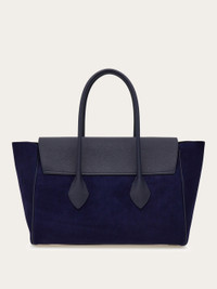 Large and spacious with high fashion appeal: the new Ferragamo tote finds its utmost expression in a deconstructed silhouette, with soft hammered calfskin on the exterior and a suede finish on the interior. The large flap with logo on the front can be slipped into the opening for two styling options. The accessory is complemented by an inner zipped pocket, a double keyring and badge charm, a stitched base, and custom metal studs to protect the base. - height 11.8 IN length 15.7 IN width 8.2 IN - Composition: calfskin suede and hammered leather - Large - Made in ITALY - Product code: 241462 785025