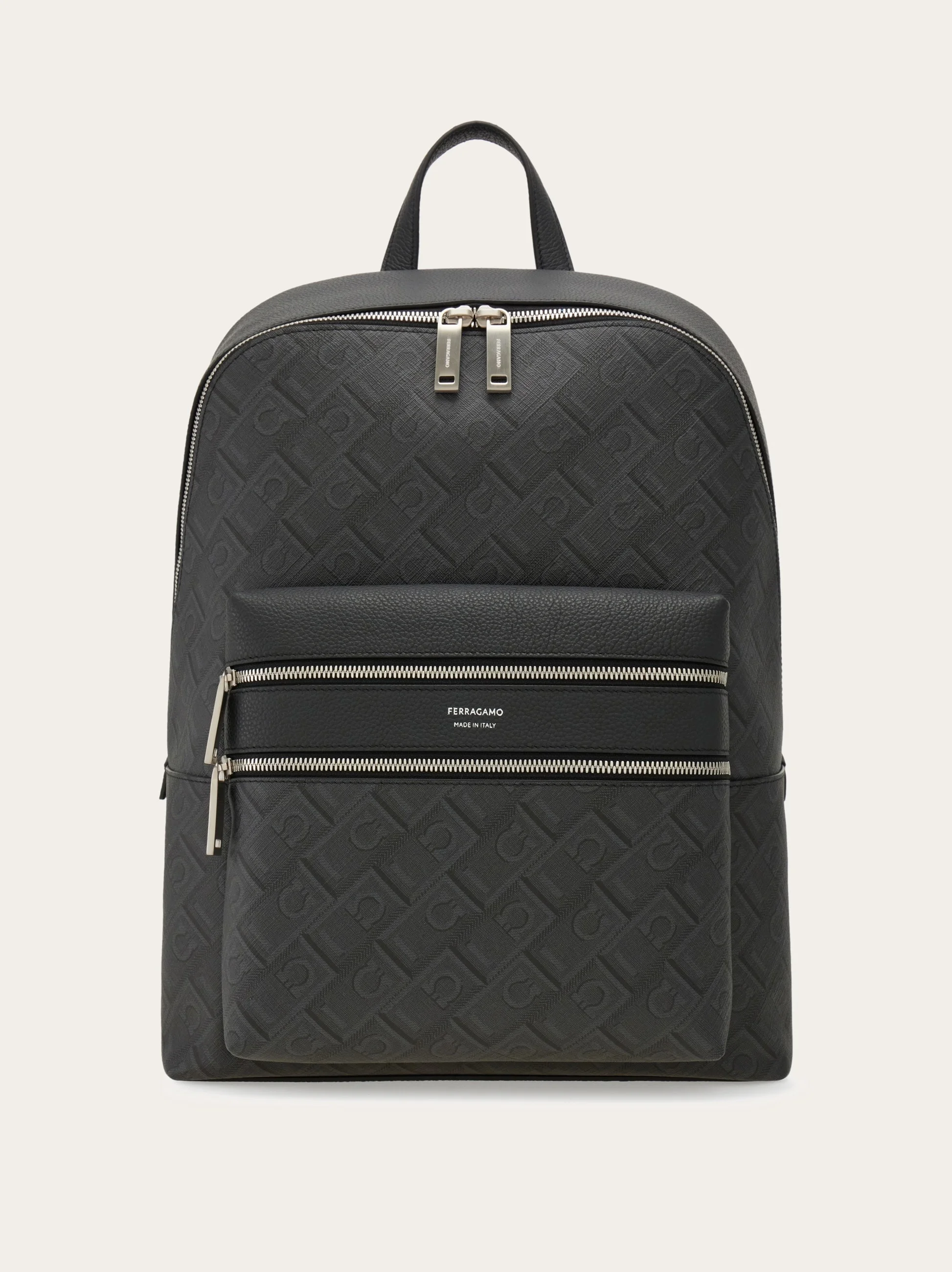 Crafted from hammered calfskin, this backpack is soft to the touch and durable. The functional and stylish design features two front pockets, decorated with a raised Gancini pattern and painted zip. The spacious interior is fitted with a padded compartment for electronic devices. Finished with a breathable fabric back panel and padded webbing shoulder straps. - height 15.7 IN length 11.8 IN width 5.1 IN - Composition: hammered calfskin and fabric - Made in ITALY - Product code: 241366 779699