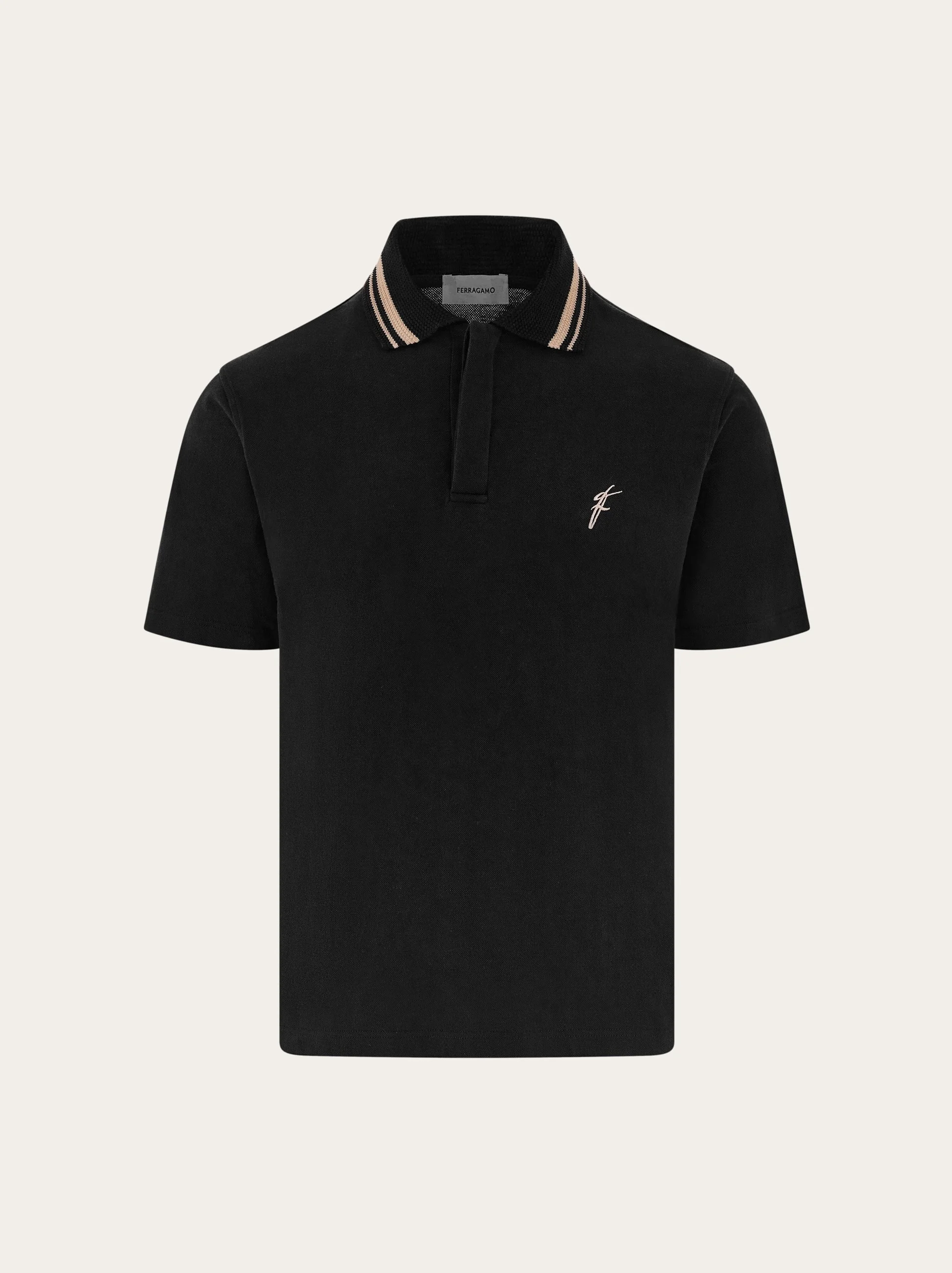 Luxurious materials and attention to detail define this cool new iteration of the Ferragamo polo shirt. Made of organic cotton, it has ribbed trims on the collar and sleeves, jacquard details on the neck, and an embroidered F on the chest. The hidden placket is a unique feature that adds a touch of formality. - Composition: 100% organic cotton - Made in ITALY - Product code: 122417 776921