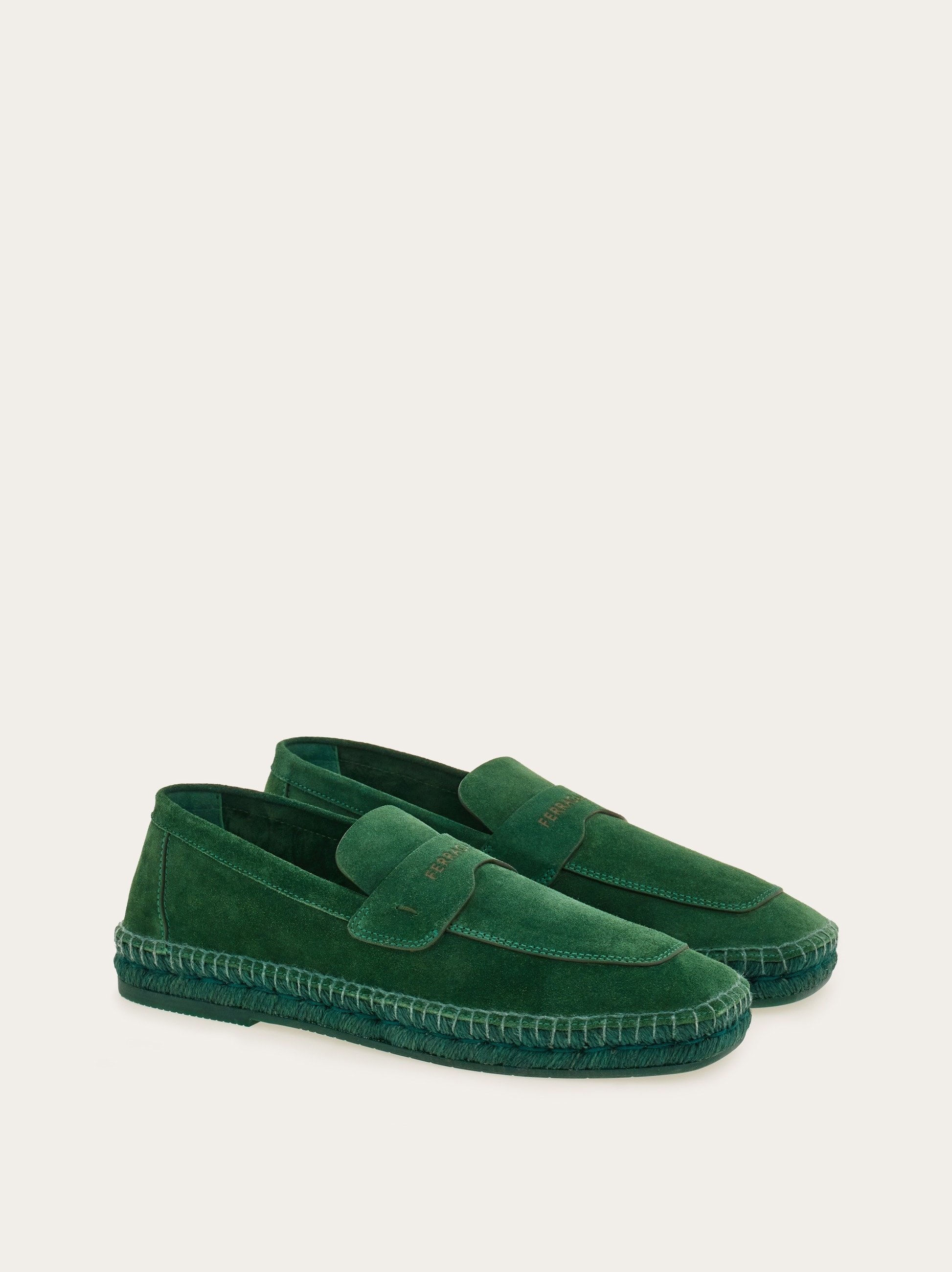 The city loafer meets the summer espadrille in this innovative Ferragamo slip on. Made of the softest suede, it features a squared toe and custom saddle across the instep. Tonal stitching and a rope wrapped sole confirm a warm weather look with visible stitching for an artisanal feel. The slim rubber sole ensures strength and stability. - Composition: suede - Made in SPAIN - Product code: 025500 773006