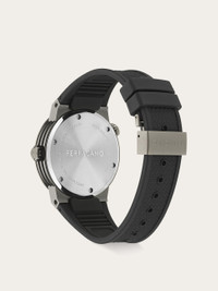 The iconic F-80 concept defines a dynamic and assertive watch whose sporty design is complemented by the advanced GMT Worldtime movement, which not only displays the local time but also includes an additional 24-hour hand for tracking a second time zone. Size: 43 mm Movement: RONDA 515.24H GMT - 4 hands quartz Case: IP gun - Crown with embossed “F” Dial: Black sunray - Red GMT hand Bracelet: Black recycled PU strap - Butterfly buckle with Ferragamo logo Glass: Sapphire crystal, anti-reflection, scratch-resistant WaterResistance: 100 meters 2+2 Year Warranty Outer box, packaging, warranty and instruction booklet - Composition: Stainless steel case and recycled PU strap - Made in SWISS - Product code: 611307 777420