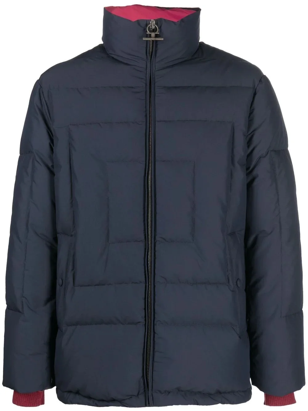 feather-down padded jacket Highlights - Feather-down padded jacket from salvatore ferragamo featuring midnight blue, red, feather down, padded design, classic hood, stand-up collar, front zip fastening, long sleeves and straight hem. Made in Italy Composition Outer: Polyester 100% Lining: Feather Down 100% SIZE & FIT Model measurements Height 6 ft 1 in(1.85 m) Bust/Chest 35.82 in(91 cm) Hips 37.79 in(96 cm) Waist 29.13 in(74 cm) FittingInformation This piece fits true to size. We recommend you get your regular size Cut for a loose fit Made with a mid-weight non-stretch fabric Washing instructions Dry Clean Only