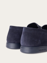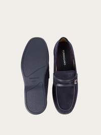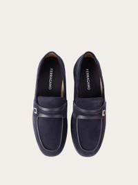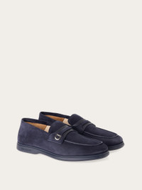Casual and cool, with a luxurious feel, this soft Ferragamo loafer is made from Italian calfskin. The almond toe is complemented by a raw edged piping around the vamp to echo an off duty vibe. The double crossbar over the instep is punctuated by a small Gancini buckle with a titanium finish. Flexible white rubber sole. - Composition: calf suede - Made in ITALY - Product code: 021599 784575