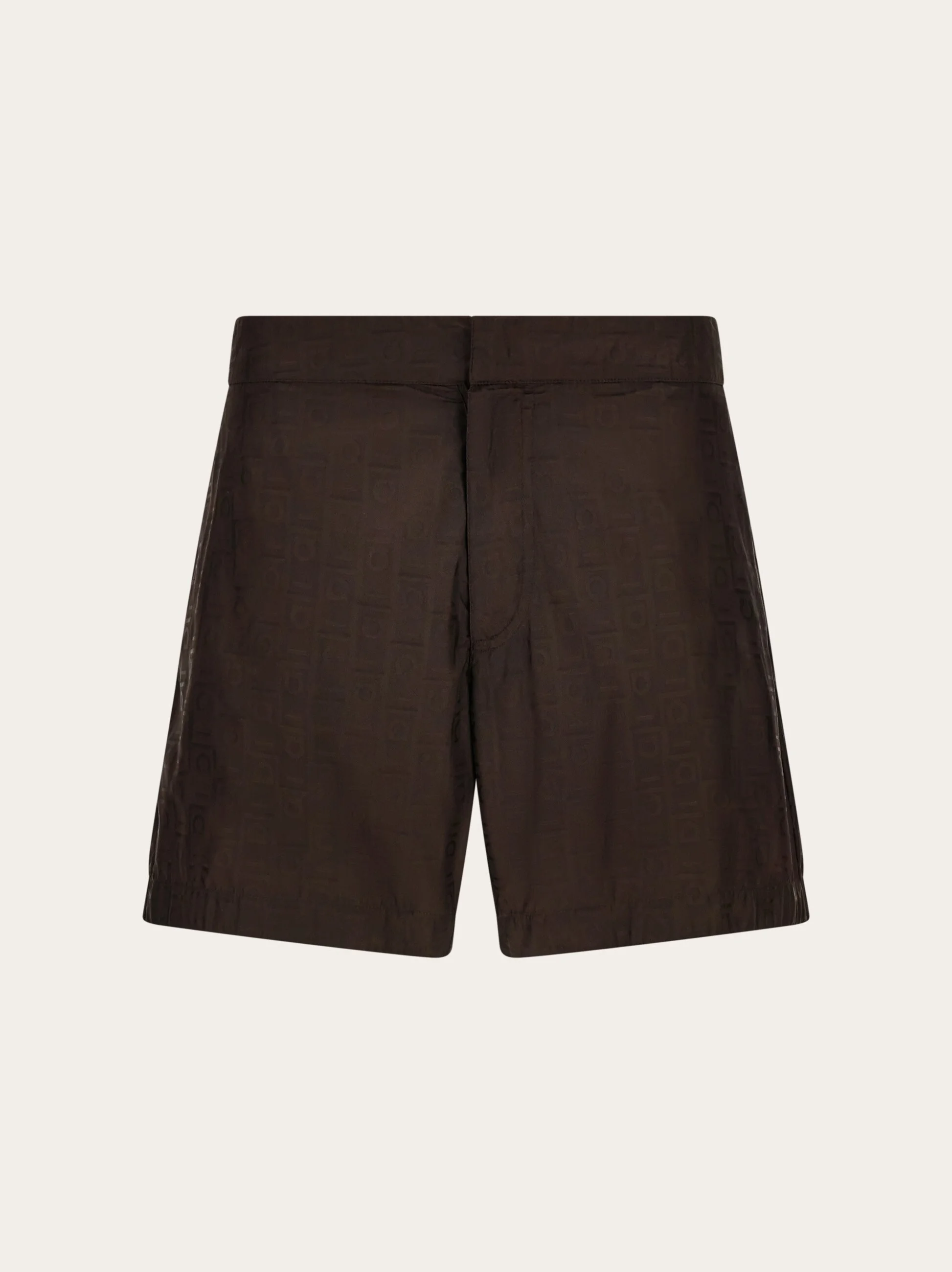 A wardrobe classic with an iconic twist. Cool new Bermuda shorts featuring the all-over Ferragamo monogram. With a regular fit and zip and button fastening, this garment is made entirely of ECONYL® yarn, a 100% regenerated nylon from both pre- and post-consumer waste. - Composition: 100% polyamide - Made in ITALY - Product code: 144484 783193