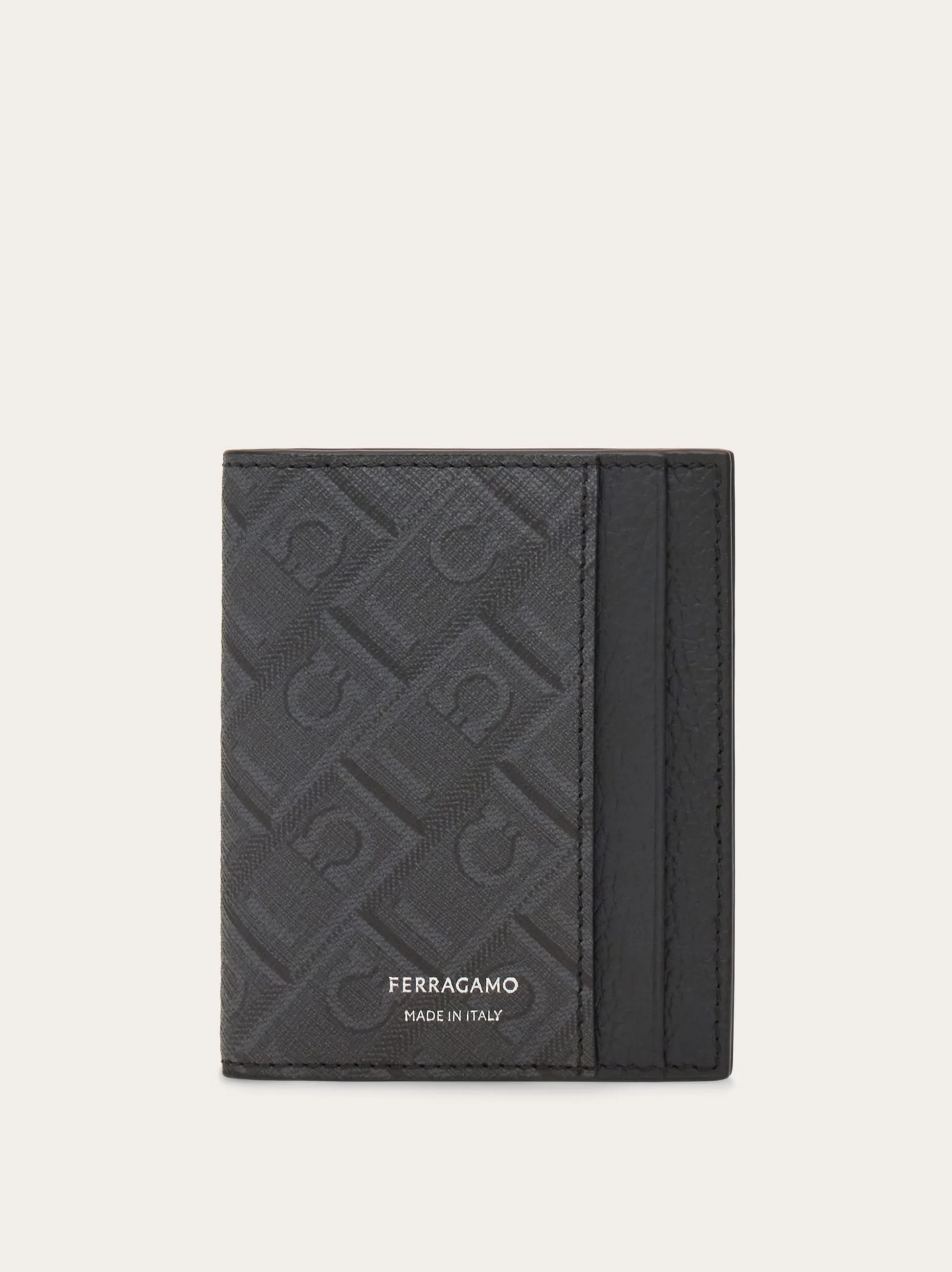 New credit card holder with book-like construction, hammered calfskin interior and coated fabric exterior with Ferragamo monogram print. The structure with multiple internal slots ensures capacity and functionality. - height 6.2 IN length 3.7 IN - Composition: hammered calfskin and coated fabric - Made in ITALY - Product code: 661586 780333