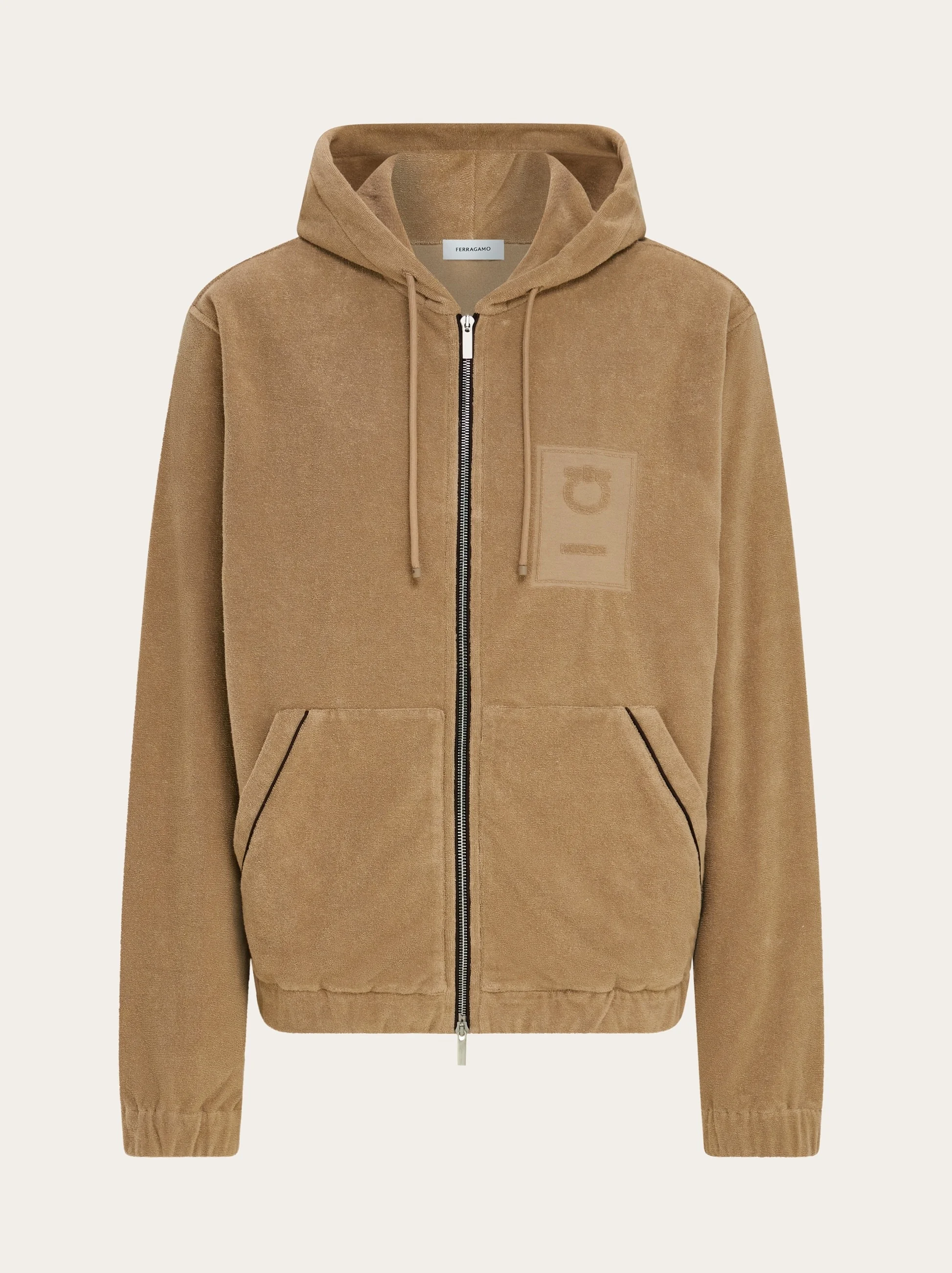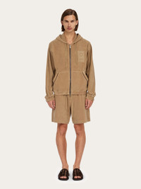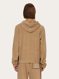 Cut from fashion's favorite textile, this new terry cotton hoodie is simply iconic. Emblazoned all over with the Ferragamo Monogram and the outline of the Hug clasp on the chest, the regular fit features a contrasting zip, large hood and contrasting trim around the marsupial pockets. This garment is made entirely from organic cotton. - Composition: 100% organic cotton - Made in ITALY - Product code: 144767 783896