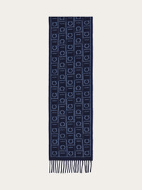 Reversible cashmere and wool blend scarf with long fringe at the bottom. The Ferragamo monogram motif runs the length of the scarf, with contrasting light tones between the two sides. - length 78.7 IN width 10.6 IN - Composition: 60% cashmere and 40% wool - Made in ITALY - Product code: 520125 779247