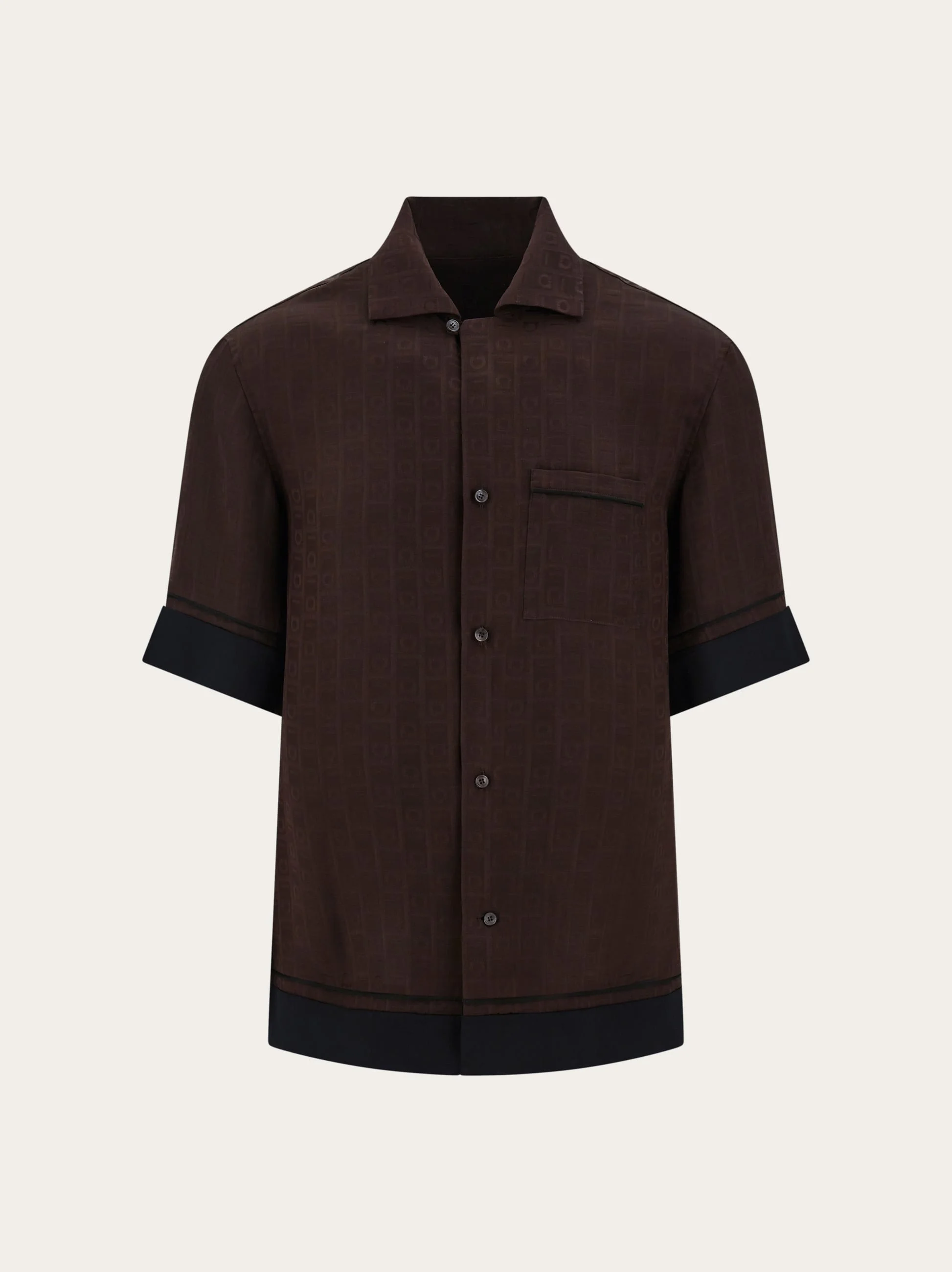 The relaxed feel of this short sleeve shirt with notch lapel and chest pocket is almost pijama-like. Featuring contrasting satin trims and an all-over Ferragamo Monogram, the main fabric of this button up with open collar is cut from pure silk. - Composition: 100% silk - Made in ITALY - Product code: 144720 783696