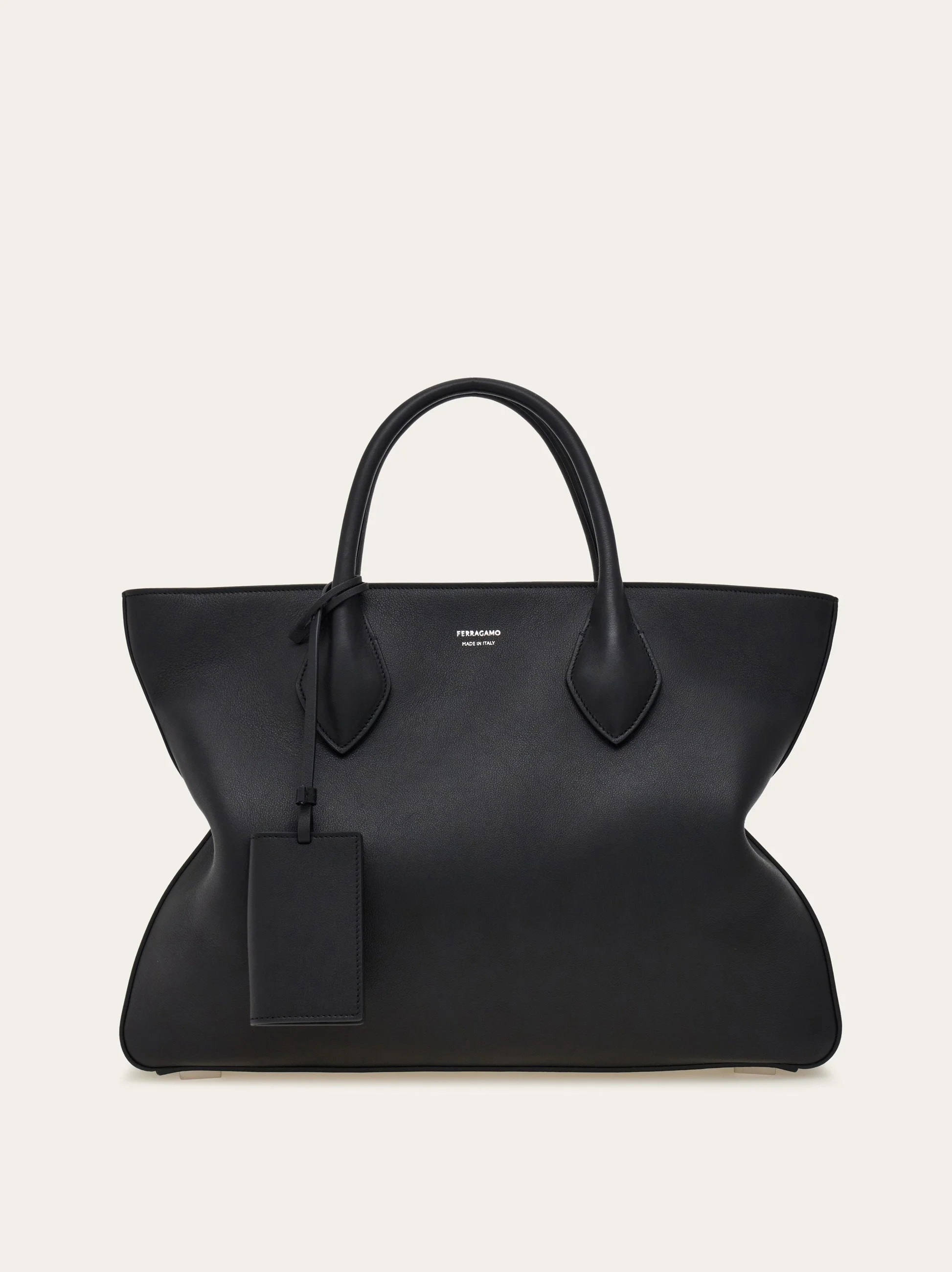 Medium, deconstructed tote with folded sides that draw the outline of a star. The hammered calfskin leather echoes a luxurious feel, with a roomy lined interior with zip pocket for perfect organization of personal effects. An address tag with key ring charm dangle from the chic top handles, and the removable jacquard strap adds an iconic twist. - height 11.8 IN length 16.1 IN width 3.5 IN - Composition: hammered calfskin - Made in ITALY - Product code: 241753 784724