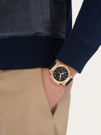 Introducing a dynamic new style in the sporty chronograph realm, the Ferragamo Sport Chrono boasts an energetic design inspired by pilot watches, tailored for modern trendsetters. This versatile, bold accessory embodies a sophisticated spirit and an adventurous vibe, making it perfect for any adventure. Size: 44 mm Movement: RONDA 3540D-Chrono Quartz Case: IP Rose Gold - Crown with embossed “F” Dial: Black matte Bracelet: Black silicon strap - Ardillon buckle with Ferragamo logo Glass: Sapphire crystal, anti-reflection, scratch-resistant WaterResistance: 100 meters 2+2 Year Warranty Outer box, packaging, warranty and instruction booklet - Composition: IP Rose Gold case with Silicon strap - Made in SWISS - Product code: 611318 784322