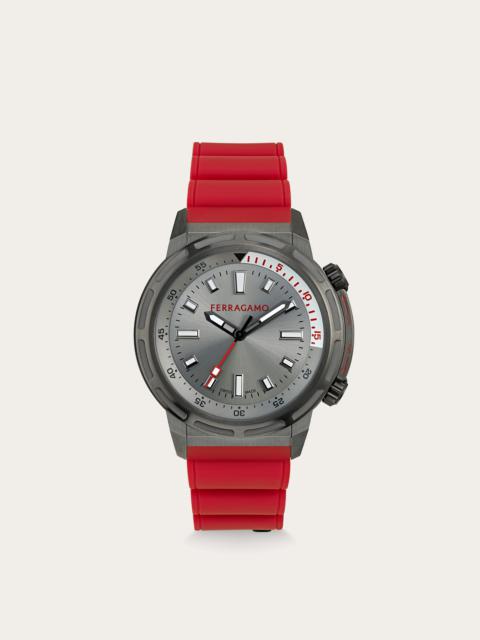 Inspired by a sneaker design, the Ferragamo Sport watch embodies a modern, active and vibrant spirit that caters to a new generation of sport luxury enthusiasts. The sunray-finished dial with contrasting accents complements the exclusive strap crafted with three tubular elements that echo the shoe construction, adding a striking 3D graphic touch to the style. <BR> <BR>Size: 46 mm <BR>Movement: RONDA 763 - 3 hands quartz <BR>Case: Stainless steel - 2H and 4H screwed crown <BR>Dial: Blue sunray and white inner ring <BR>Bracelet: Blue silicone with white logo - Ardillon buckle with Ferragamo logo <BR>Glass: Sapphire crystal, anti-reflection, scratch-resistant <BR>WaterResistance: 200 meters <BR>2+2 Year Warranty <BR>Outer box, packaging, warranty and instruction booklet - Composition: Stainless steel case and silicone strap - Made in SWISS - Product code: 611308 777444