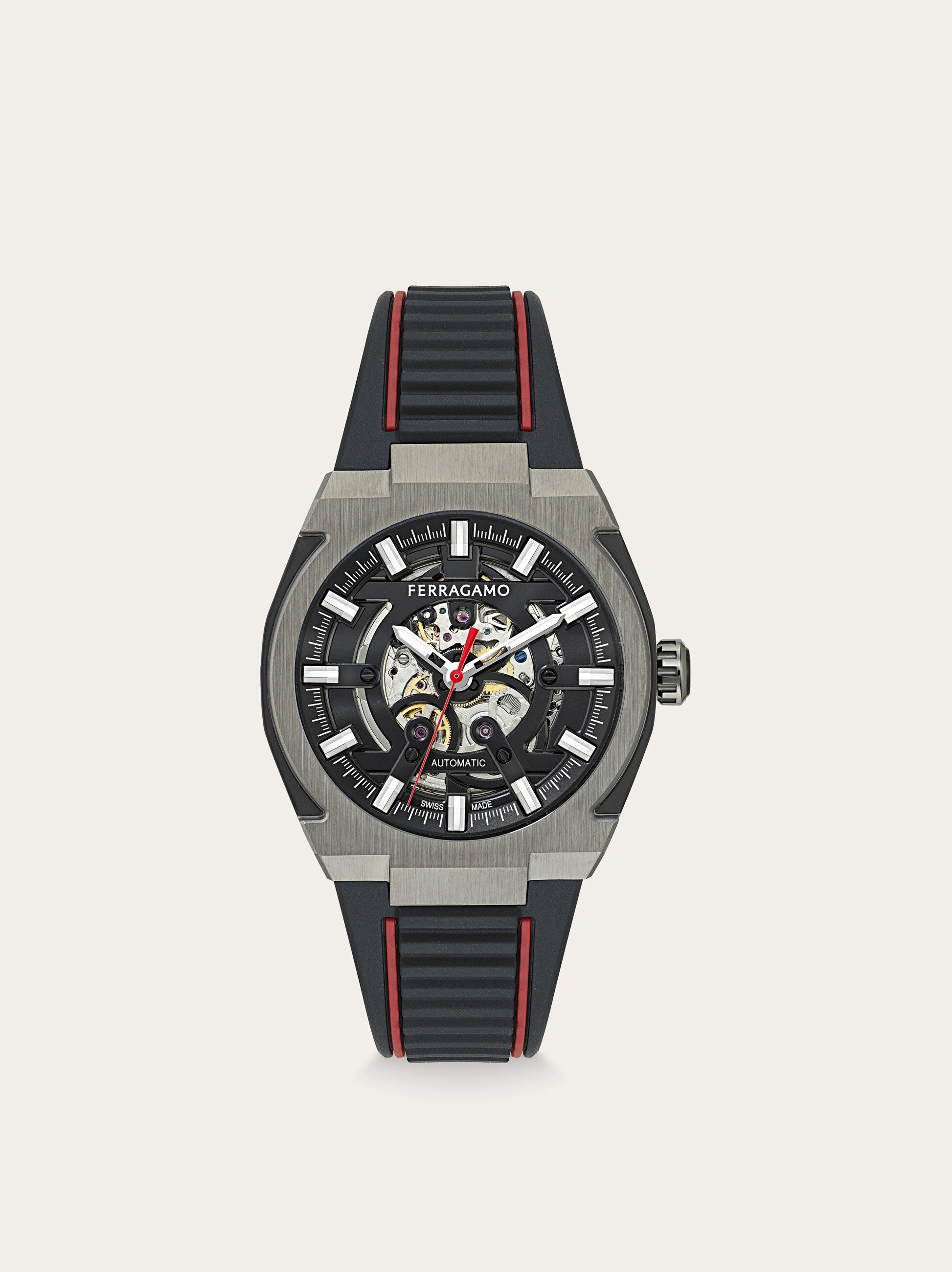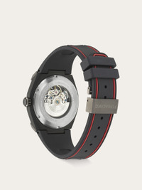 The quintessence of the House’s sports luxury spirit, the Ferragamo Supreme Skeleton with automatic movement features a refined construction in contrasting textures and finishes. The dial and the round case in matte gun and black are highlighted by vibrant Ferragamo red accents that enhance the high-impact design conceived for life in motion.<BR><BR> <BR> <BR>Size: 43 mm <BR>Movement: LANDERON SWISS MOV. DP24 - 3 Hands Auto <BR>Case: Bicolor (IP gun & IP black) - IP black crown with embossed “F” <BR>Dial: Black skeleton dial <BR>Bracelet: Black recycled PU strap - Deployant buckle with Ferragamo logo <BR>Glass: Sapphire crystal anti-reflection, scratch-resistant <BR>WaterResistance: 50 meters <BR>2+2 Year Warranty <BR>Outer box, packaging, warranty and instruction booklet - Composition: IP gun case and recycled PU strap - Made in SWISS - Product code: 611309 778120