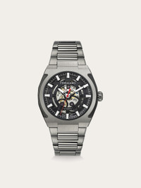 The quintessence of the House’s sports luxury spirit, the Ferragamo Supreme Skeleton with automatic movement features a refined construction in contrasting textures and finishes. The dial and the round case in matte gun and black are highlighted by vibrant Ferragamo red accents that enhance the high-impact design conceived for life in motion.<BR><BR> <BR> <BR>Size: 43 mm <BR>Movement: LANDERON SWISS MOV. DP24 - 3 Hands Auto <BR>Case: Bicolor (IP gun & IP black) - IP black crown with embossed “F” <BR>Dial: Black skeleton dial <BR>Bracelet: IP gun bracelet - Butterfly buckle with Ferragamo logo <BR>Glass: Sapphire crystal anti-reflection, scratch-resistant <BR>WaterResistance: 50 meters <BR>2+2 Year Warranty <BR>Outer box, packaging, warranty and instruction booklet - Composition: IP gun case and bracelet - Made in SWISS - Product code: 611310 778121