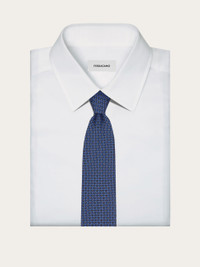 Gancios and hearts animate this pure silk tie adding a sense of whimsy to business looks. The tie is reversible, with a printed pattern of geometric Gancini and hearts on one side, and back to back hearts on the other. - Composition: 100% silk - Made in ITALY - Product code: 351259 784220