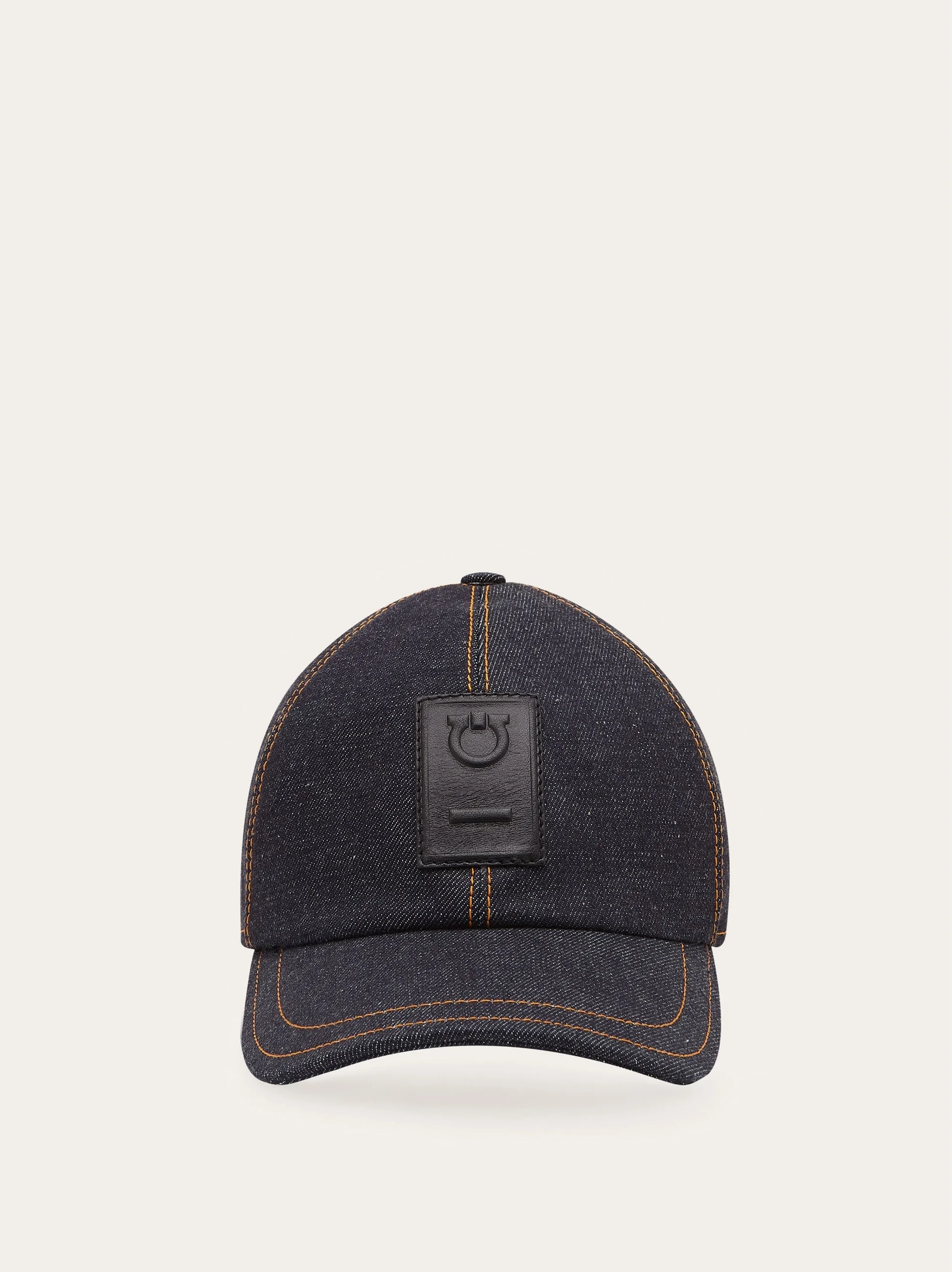 Dark unwashed denim baseball cap, featuring a topstitched brim and a leather patch with embossed Gancini. This accessory is complemented by the cotton lining and adjustable strap on the back. - Composition: 100% cotton - Made in ITALY - Product code: 560073 771443
