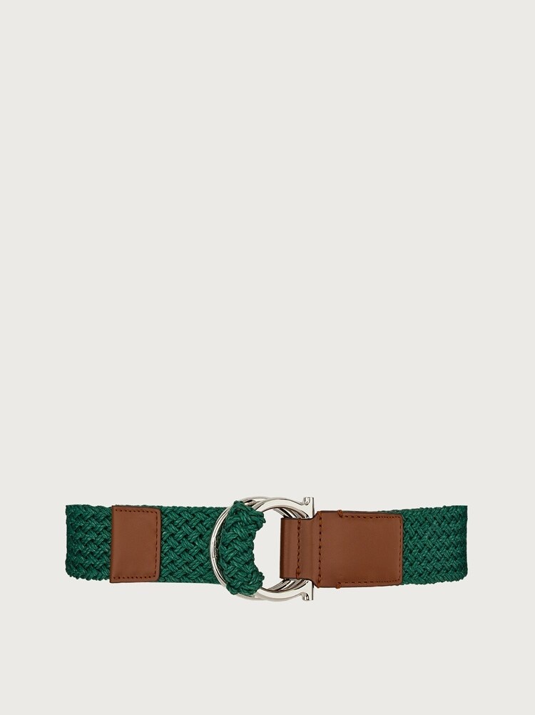 Cool new styles in this trendy off duty belt. The woven elasticated shaft in bright seasonal colors looks perfect with chinos or your favorite denim. Contrasting leather details and a double ring Gancini buckle add the Ferragamo finish. - Composition: fabric and calf leather - Made In ITALY