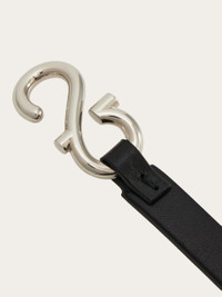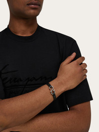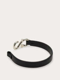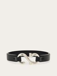 A stylized Gancini forms the central element of this new leather bracelet. The S-like shape also acts as a hook to fasten and undo it. - Composition: 60% calfskin, 40% brass - Size 19 - Made in ITALY - Product code: 770386 784872