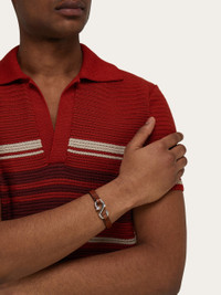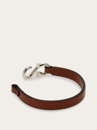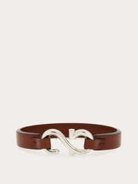 A stylized Gancini forms the central element of this new leather bracelet. The S-like shape also acts as a hook to fasten and undo it. - Composition: 60% calfskin, 40% brass - Size 19 - Made in ITALY - Product code: 770386 784870