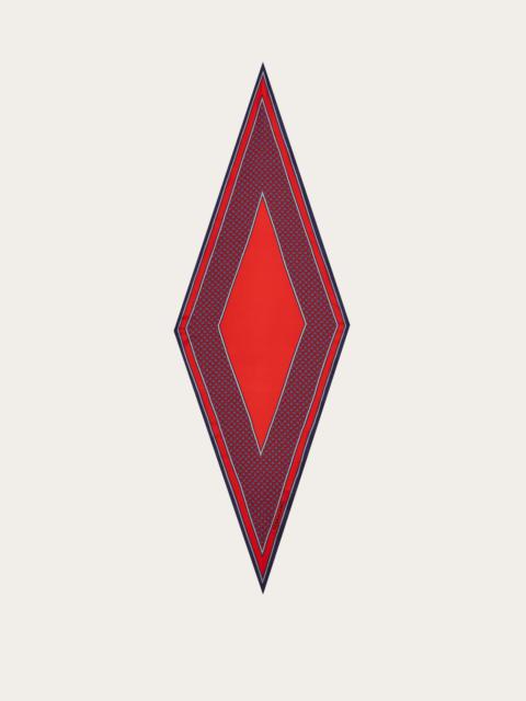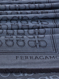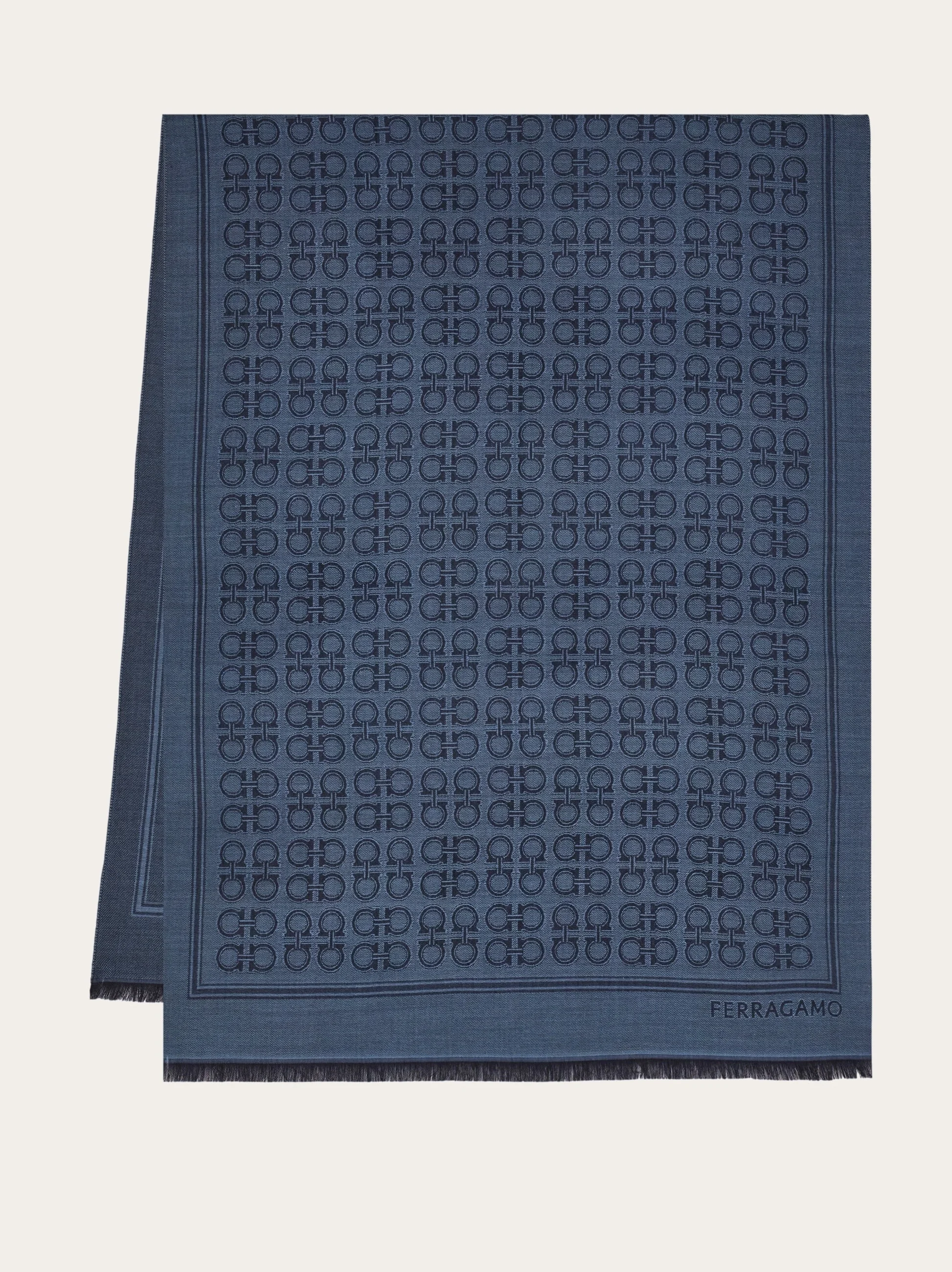 Subtle and extremely sophisticated, this pure wool and silk shawl is covered in a geometric pattern of the iconic Gancini. A tonal frame completes the design with fringed edges and tonal logo in the bottom corner. - length 70.8 IN width 27.5 IN - Composition: 90% pure virgin wool, 10% silk - Made in ITALY - Product code: 520144 785253