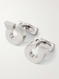 These cufflinks are modelled in the shape of Ferragamo's signature 'Gancini' motif. They're cast from palladium-plated brass that's polished for a high shine and are engraved with the brand's moniker along the front. Size & Fit - Length: 1.5cm / 0.6in - Width: 1.5cm / 0.6in Details & Care - Palladium-plated brass - T-bar fastenings - Come in a presentation box