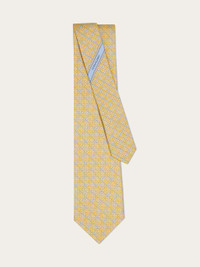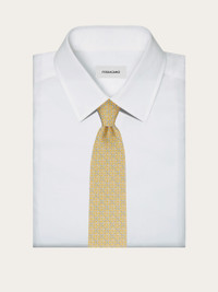 The iconic symbol of the House of Ferragamo, the Gancini, is locked behind a geometric grid on this pure silk tie. The pattern is sophisticated, featuring contrasting tones which add a pop of color. - Composition: 100% silk - Made in ITALY - Product code: 351254 784166