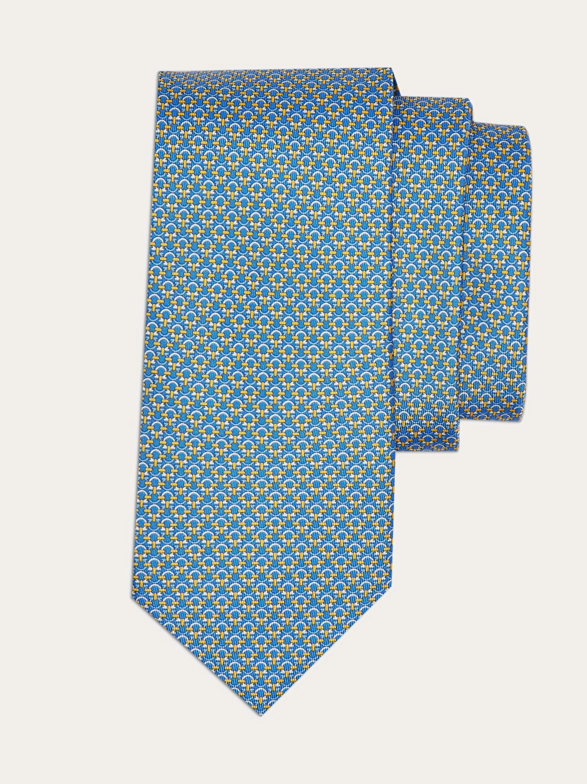Modern interpretation of the iconic Gancini tie. The pure silk provides a luminous background to the elegant timeless pattern: the Ferragamo Gancini, linked to form a line of chains. A must have for every gentleman. - Composition: 100% silk - Made in ITALY - Product code: 358771 722510